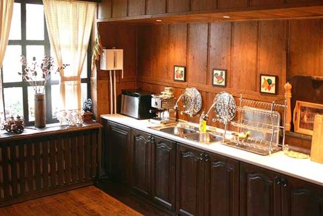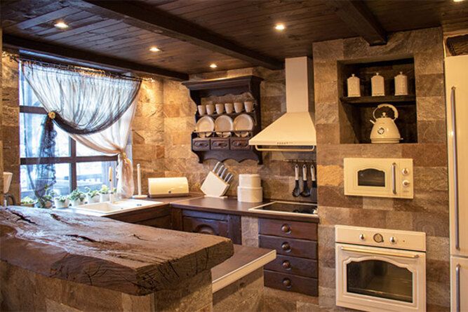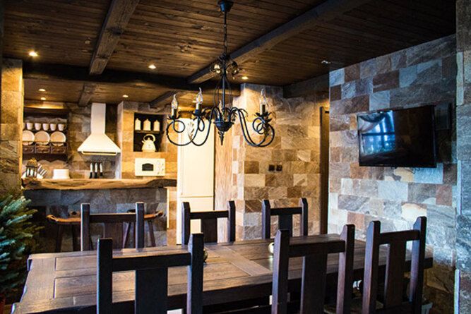 Кухнята е оборудвана с всичко необходимо за приготвянето на вашата трапеза. Електроуредите и посудата са от най-висок клас. Трапезарията е оборудвана с голяма трапезна маса за 6 човека, LCD телевизор и камина на дърва, която придава невероятна романтика. Камината е с 2 лица и докато седите на сладки приказки, опънати в меката мебел в хола може да се наслаждавате на живия огън.