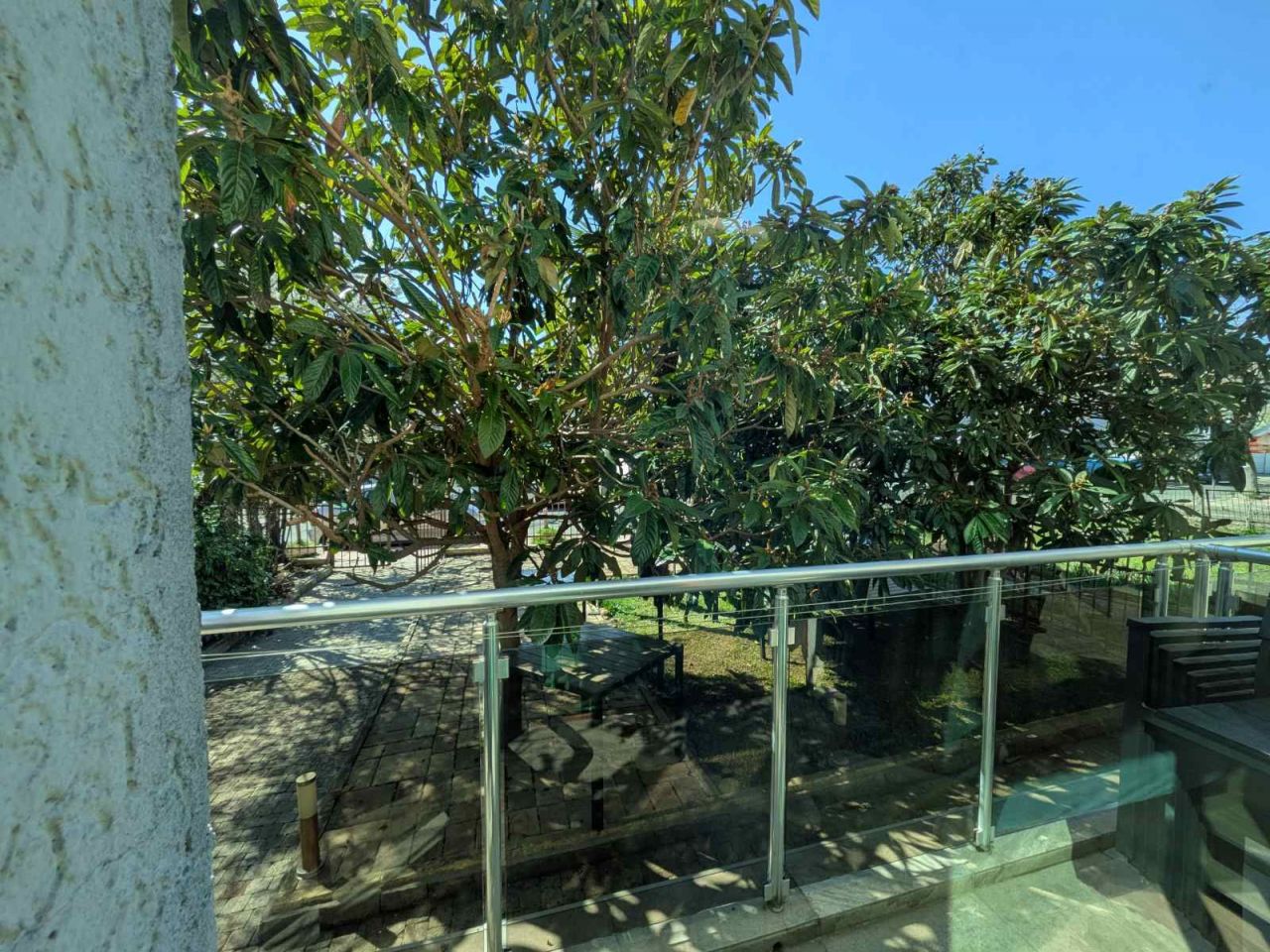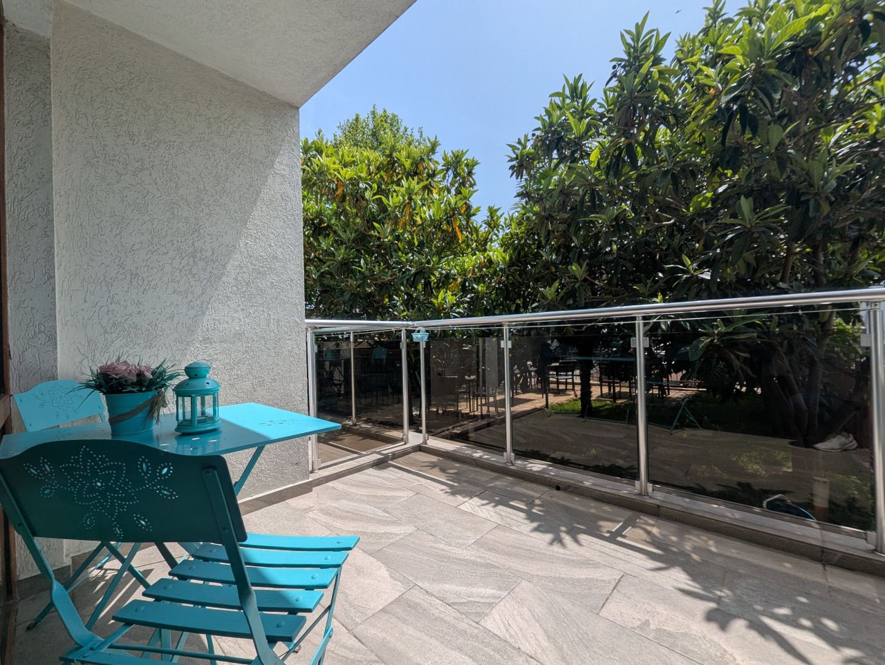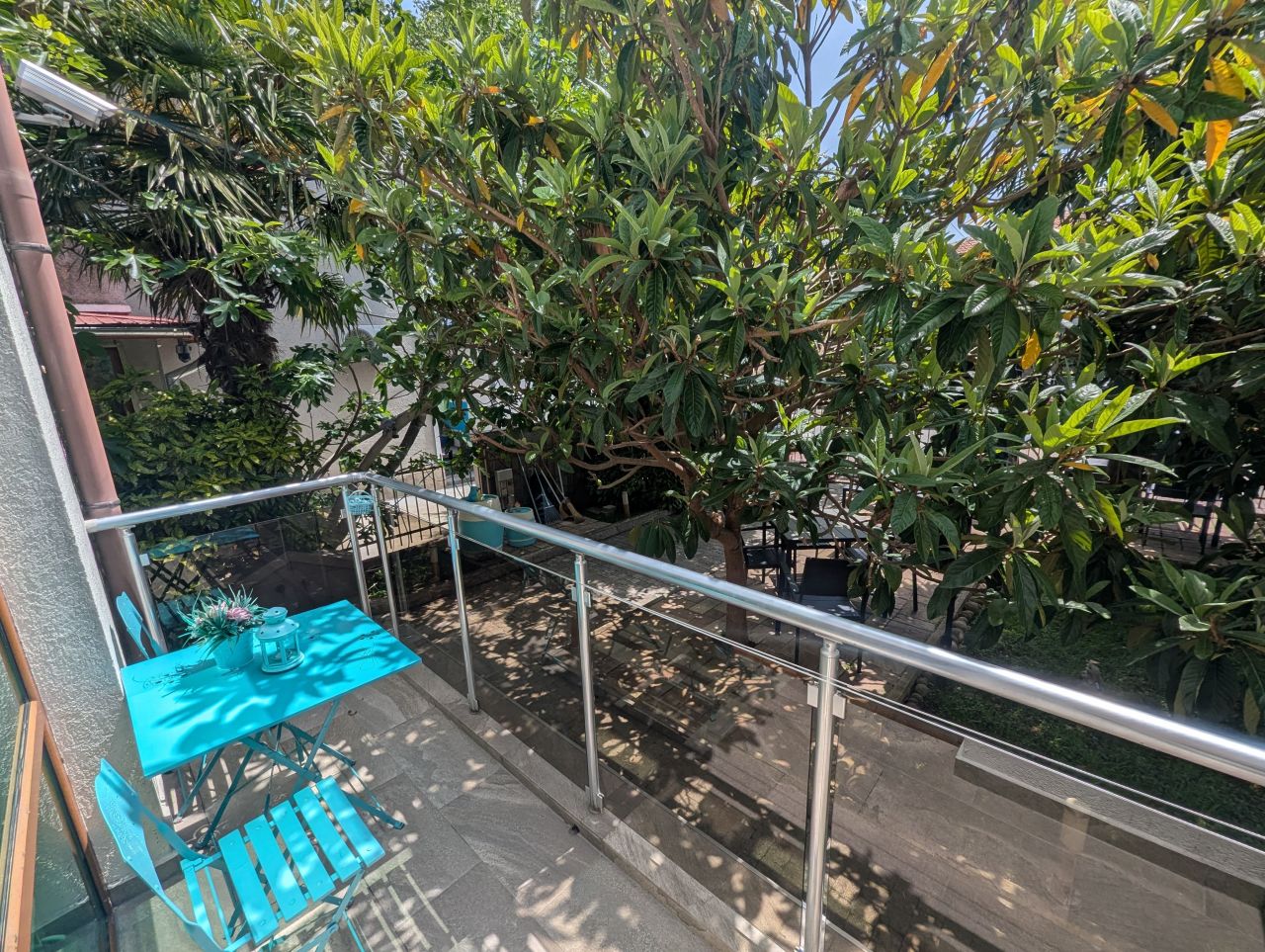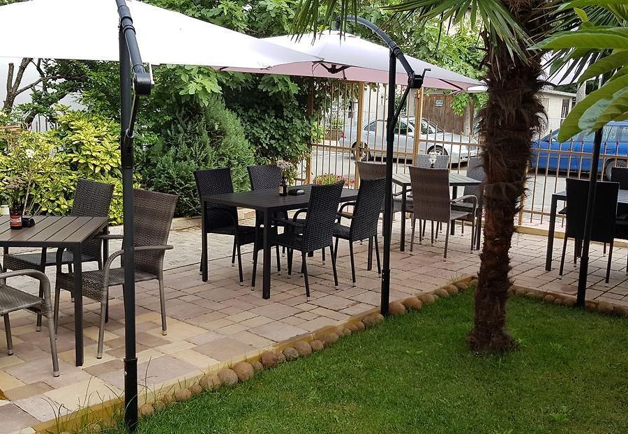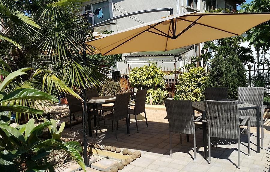 - Вечно зелен двор, с палми и красиви дървета, предлагащи сянка през целия ден като седнете на масичките със столовете в двора.