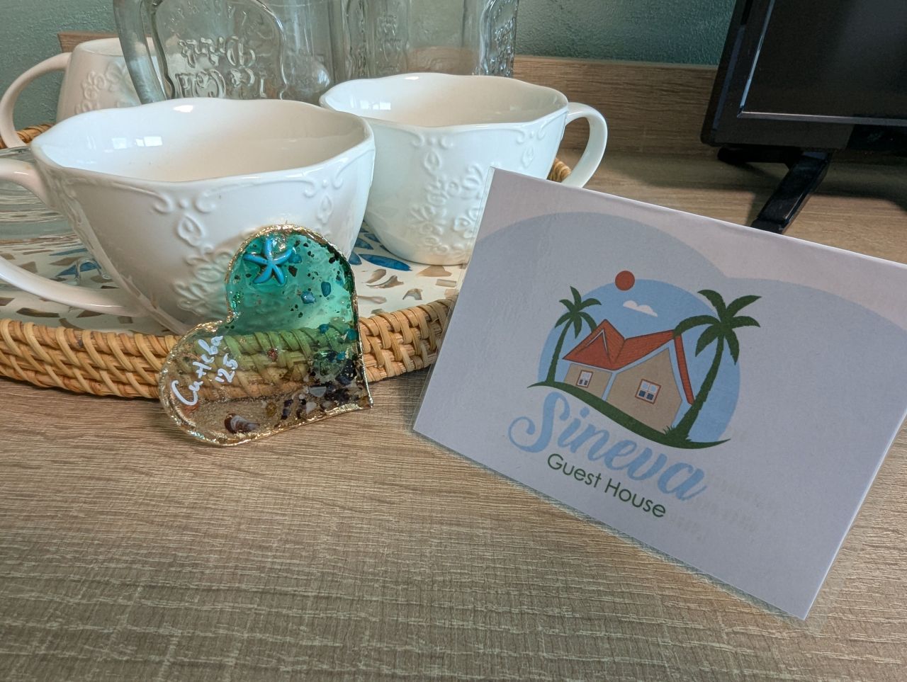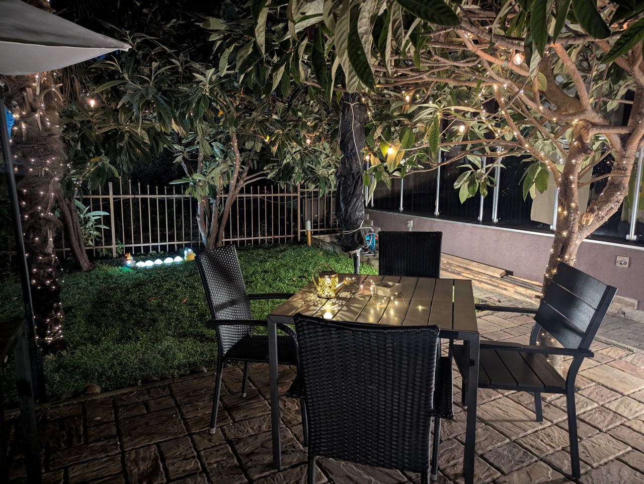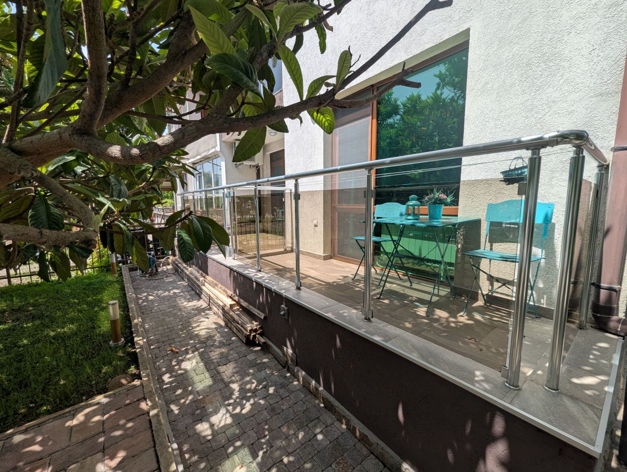 - Вечно зелен двор, с палми и красиви дървета, предлагащи сянка през целия ден като седнете на масичките със столовете в двора.