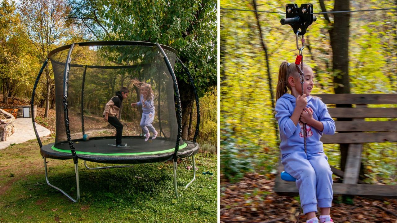 - много детски съоражения – батут, люлки, пързалки, катерушки, пясъчник, въжен тролей