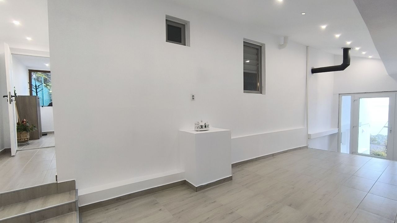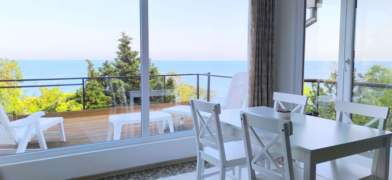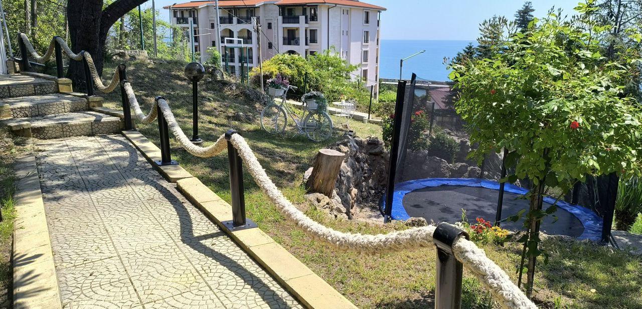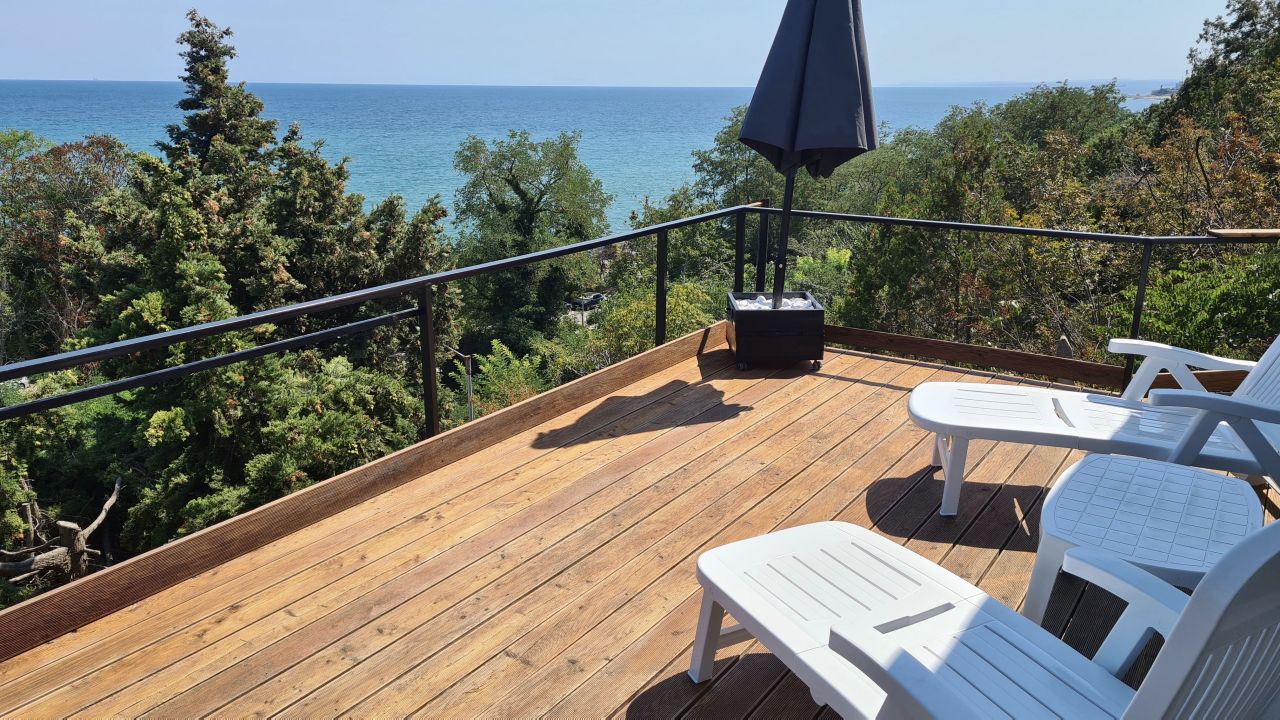 До вилата се стига по няколко стъпала. Разполага и с механа със съвременна и напълно оборудвана кухня. В нея на ваше разположение са посуда за готвене, сервиране и хранене, керамични котлони, фурна, хладилник с фризер, скара и фритюрник. Две от стаите са разположени на първия етаж, както и малък хол с диван. Те разполагат с двойни легла и предлагат красива гледка към градината и морето. За вашия абсолютен комфорт и качествен сън, всички легла в къщата са оборудвани с висок клас матраци.