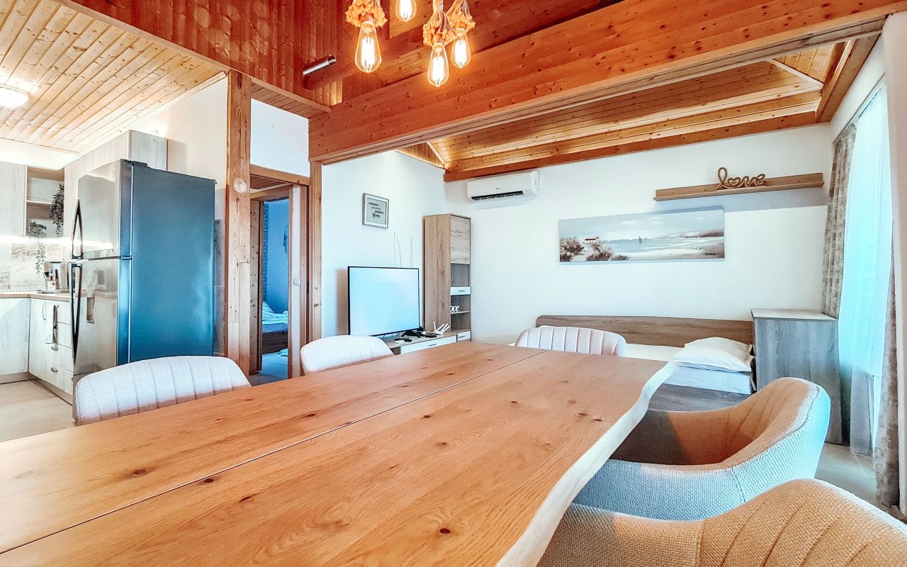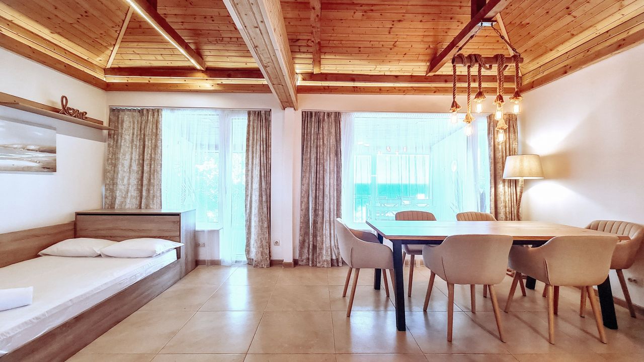 Вила 2 - Предлага 1 спално помещение, което разполага с двойно легло и отделно разтегателен диван, разположен в хола. Вилата е с една баня и тоалетна. Максималният капацитет за настаняване е до 4 души. На ваше разположение е съвременна и напълно оборудвана кухня с посуда за готвене, сервиране и хранене, керамични котлони, фурна, хладилник с фризер, електрическа кана, кафемашина, тостер.