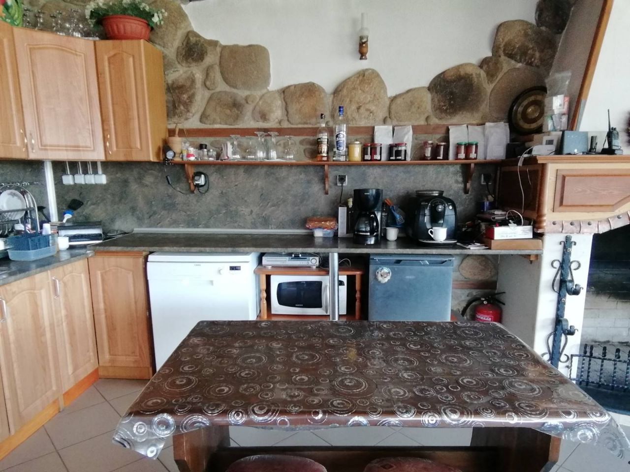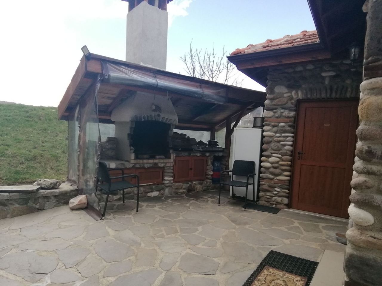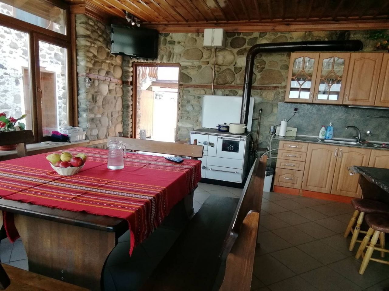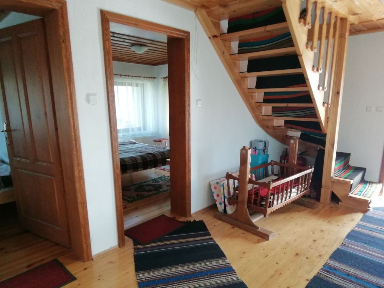 Къщата разполага с двойни и тройни стаи. Кухнята е отделена от спалните помещения в просторна механа, изградена от речен камък. Има голяма камина и изглед с красива панорама.