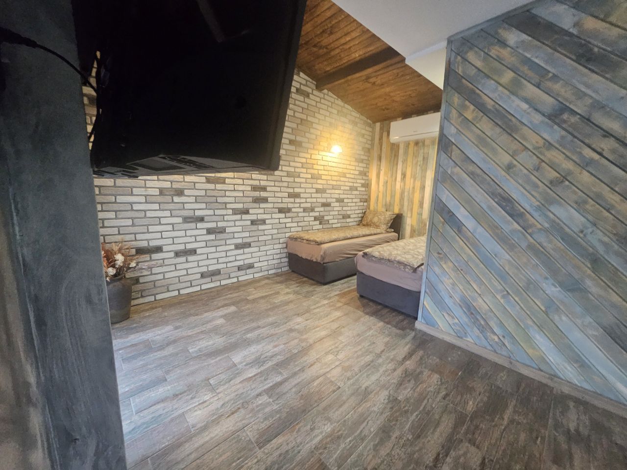 Къщата е на два етажа и разполага с двор, барбекю, оборудвана кухня, санитарен възел, две спални, телевизор с кабелна телевизия, климатик, камина и паркинг.