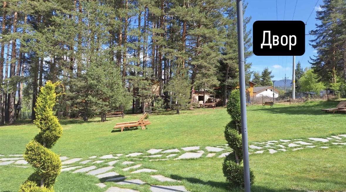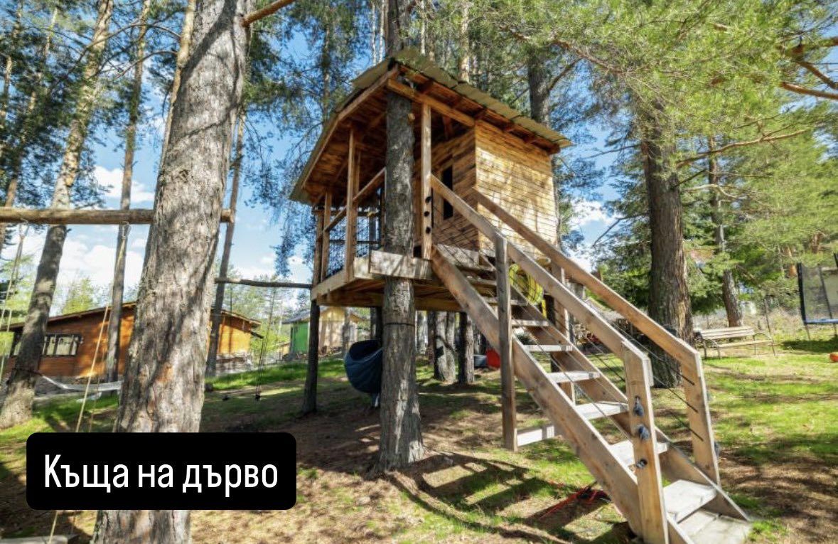 На разположение са просторна поляна, детски кът с къща на дърво, батут, люлки, както и игри и зони за отдих.