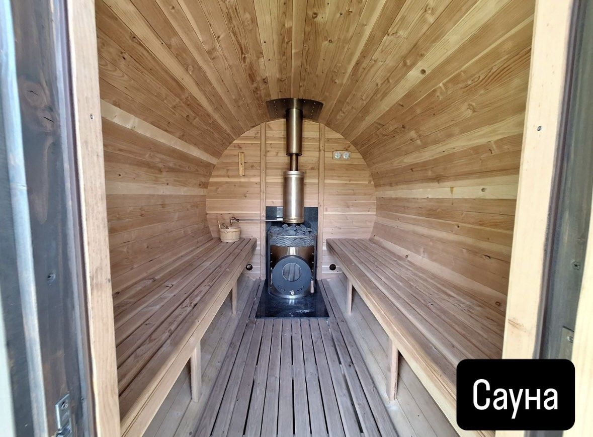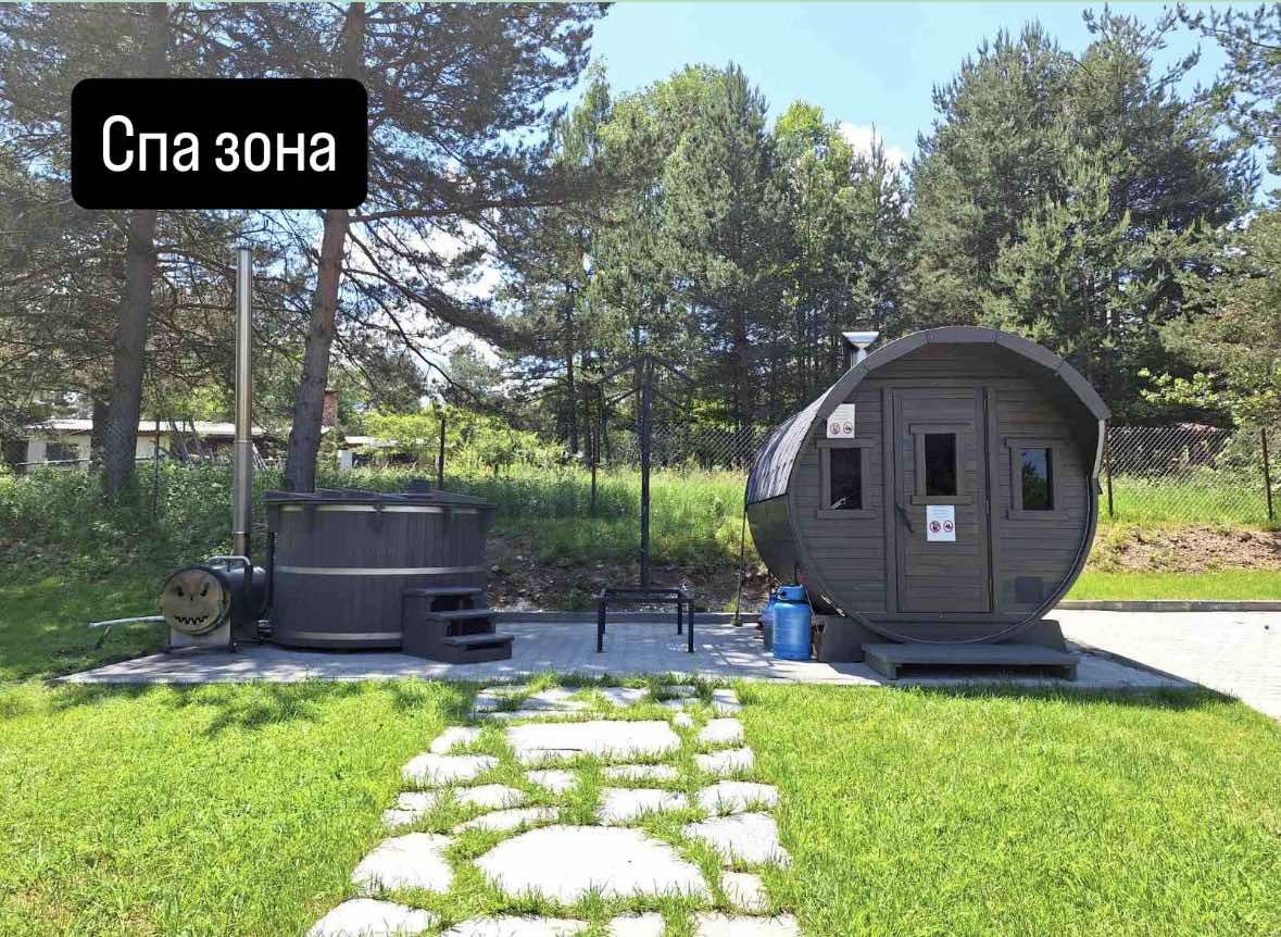 Споделена СПА зона на открито, включваща сауна, джакузи и шезлонги.