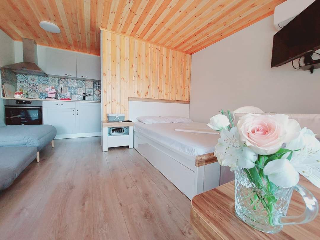 Къщата е самостоятелна - тип студио. Разполага с двойно легло и две разтегателни кресла, кухненски бокс и собствен санитарен възел.