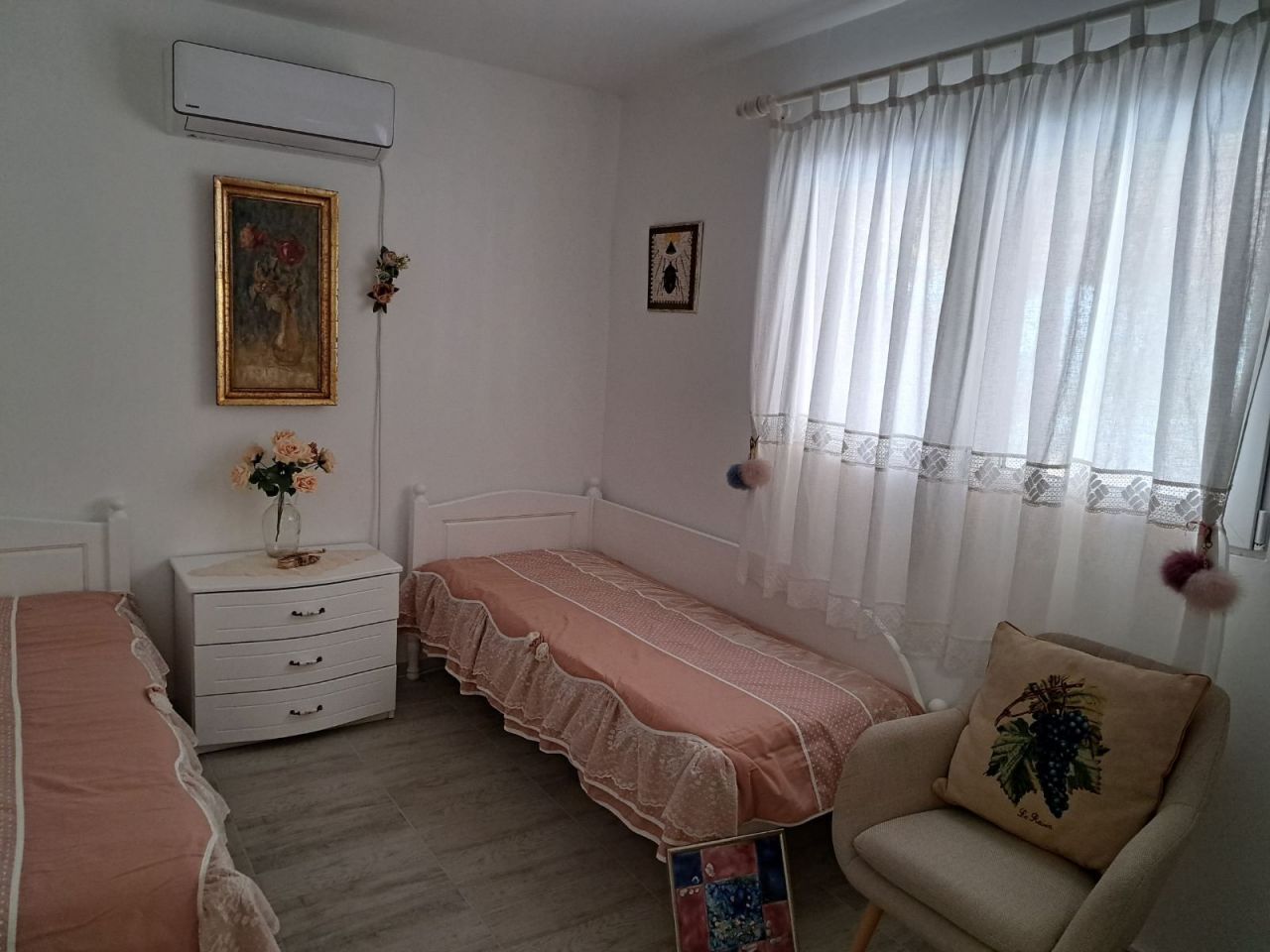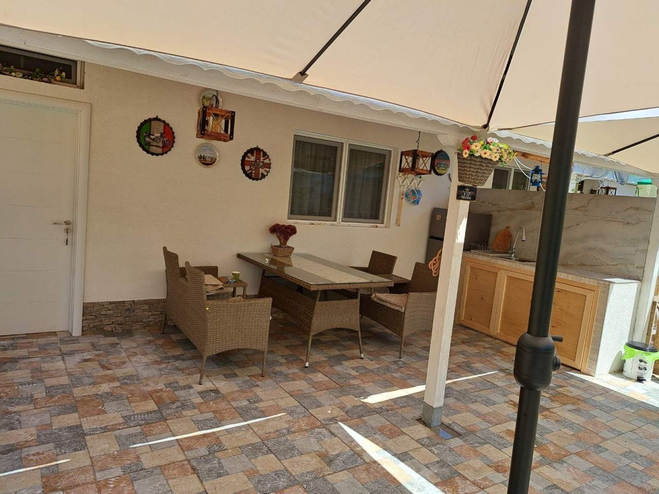 VIP къщички за 4-ма - коридор с 2 отделни стаи, една спалня и стая с две единични легла. Обзавеждане масив. Къщичката има самостоятелен двор, просторна веранда с кухненски блок, ратанови маса и пейки, голям хладилник, посуда, във всяка стая климатик, гардероб, Wi-Fi, ТВ и комарници.