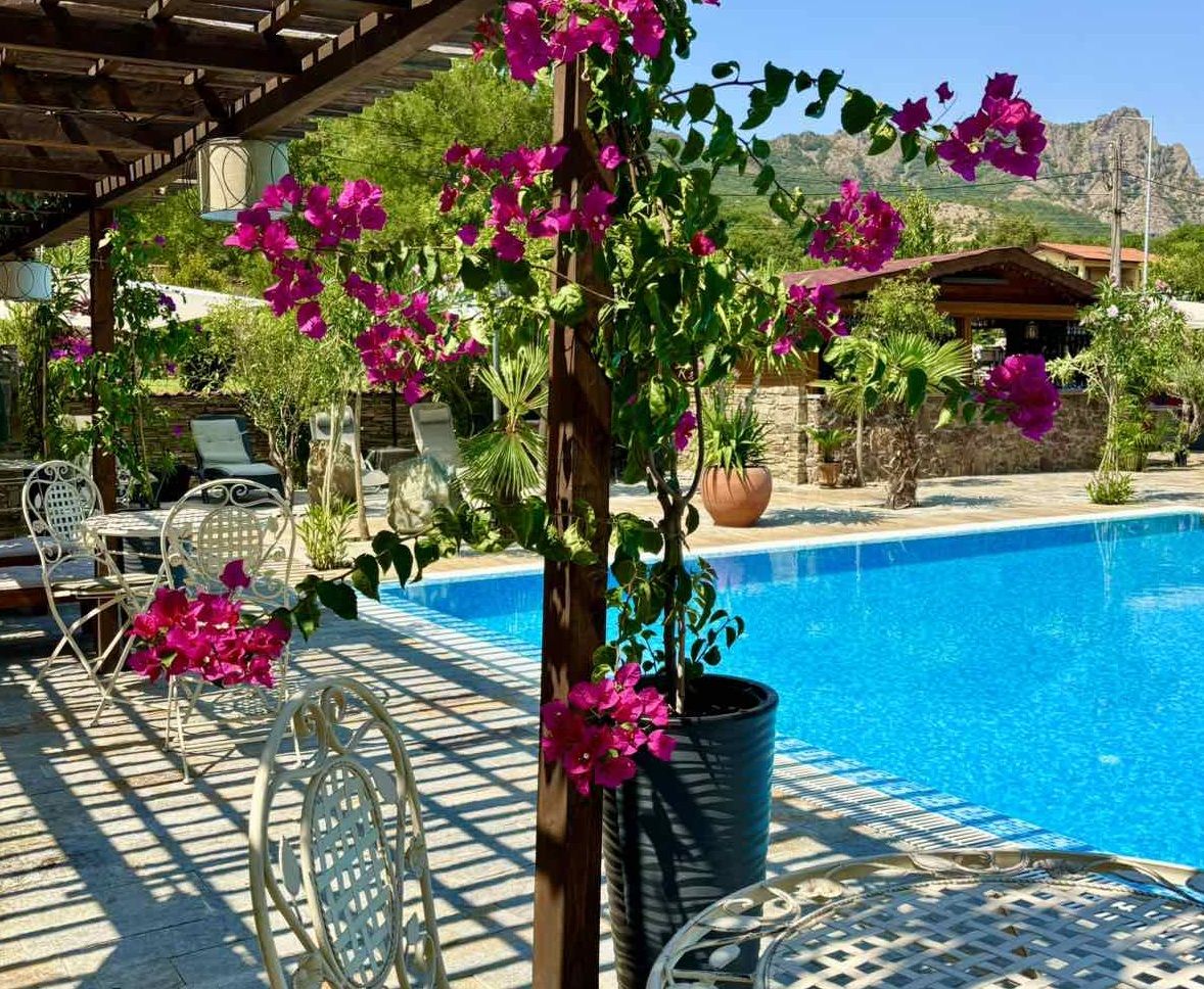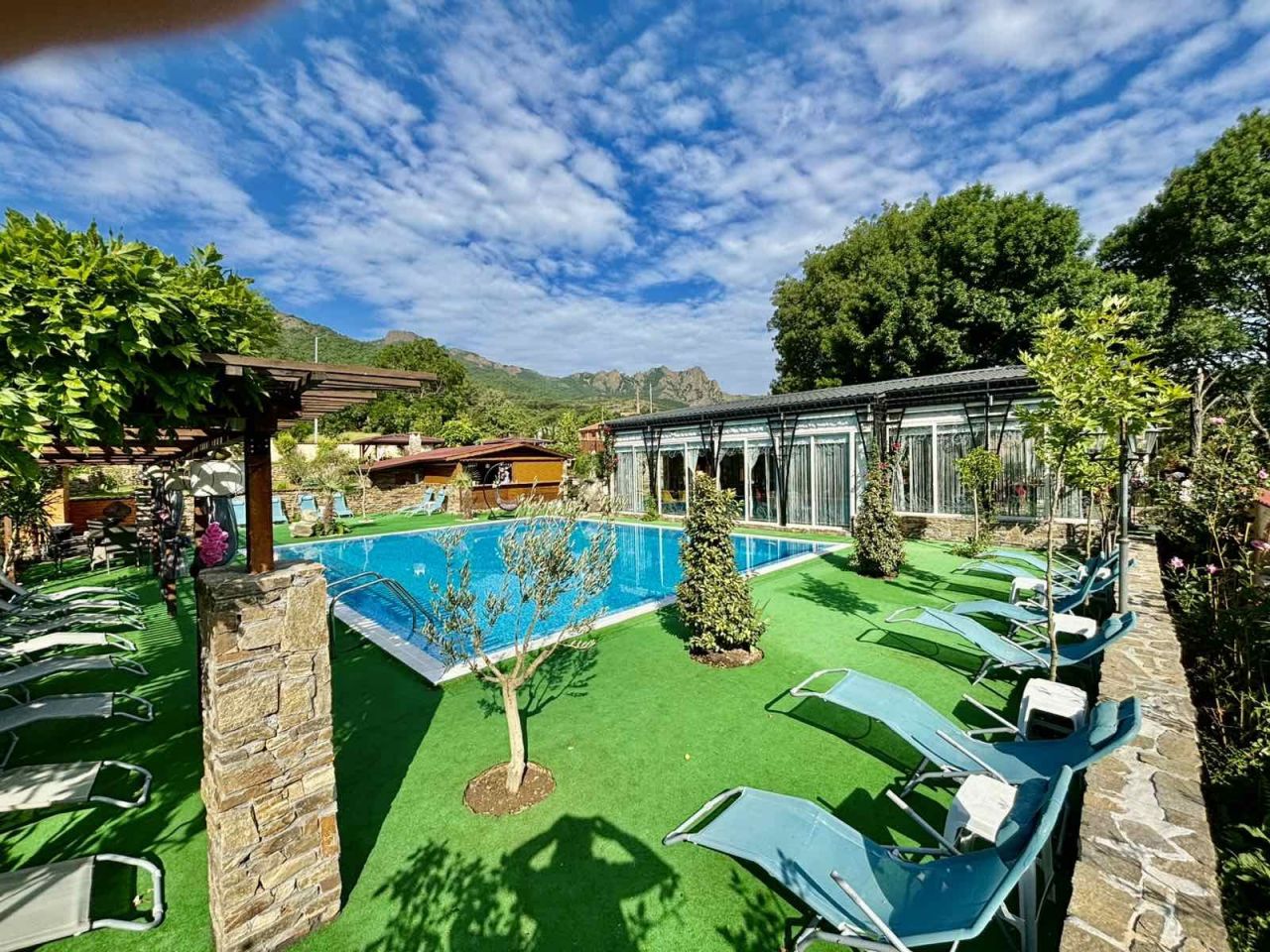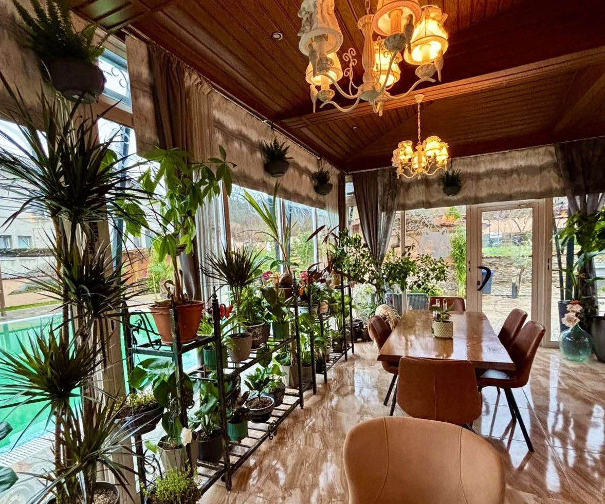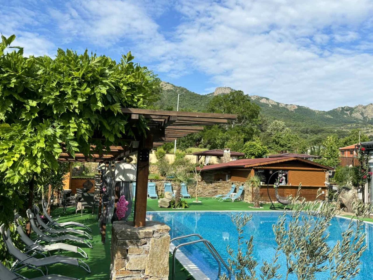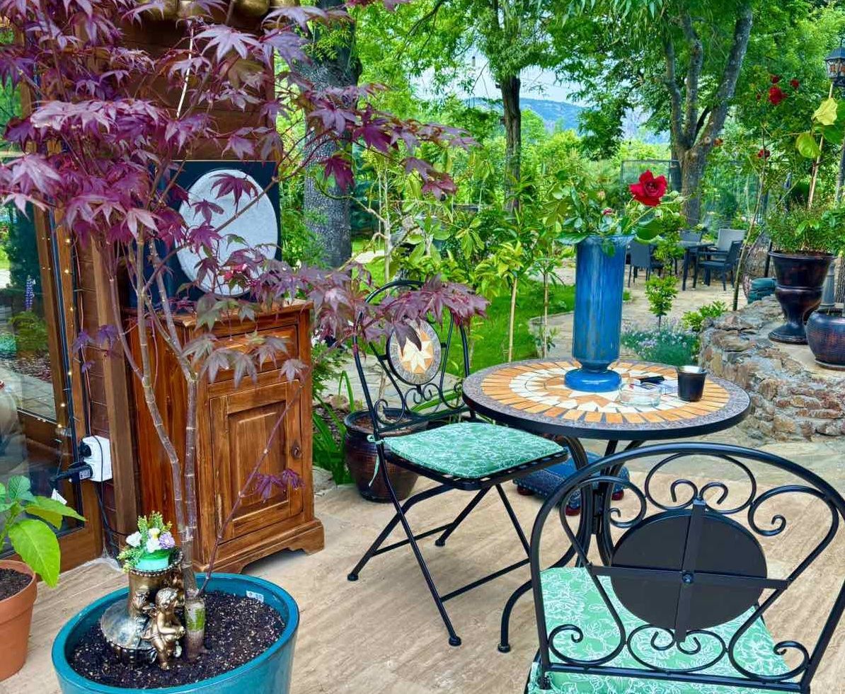 Къщата е с прекрасна гледка към планини и скали и невероятна лятна градина с много растителност и цветя.