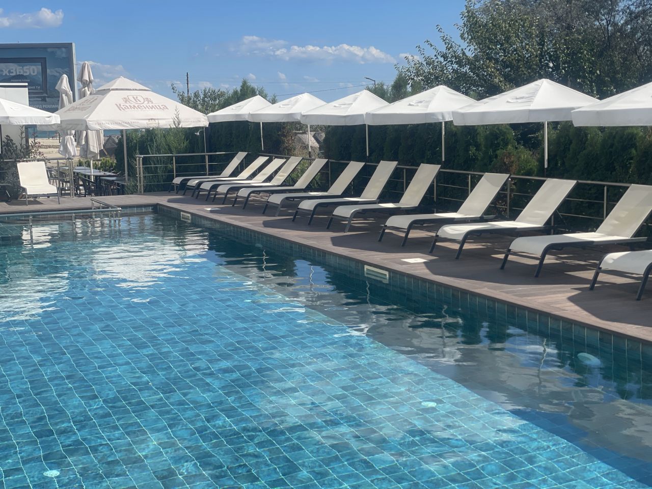 - Външен басейн за летния сезон с шезлонги и зони за почивка