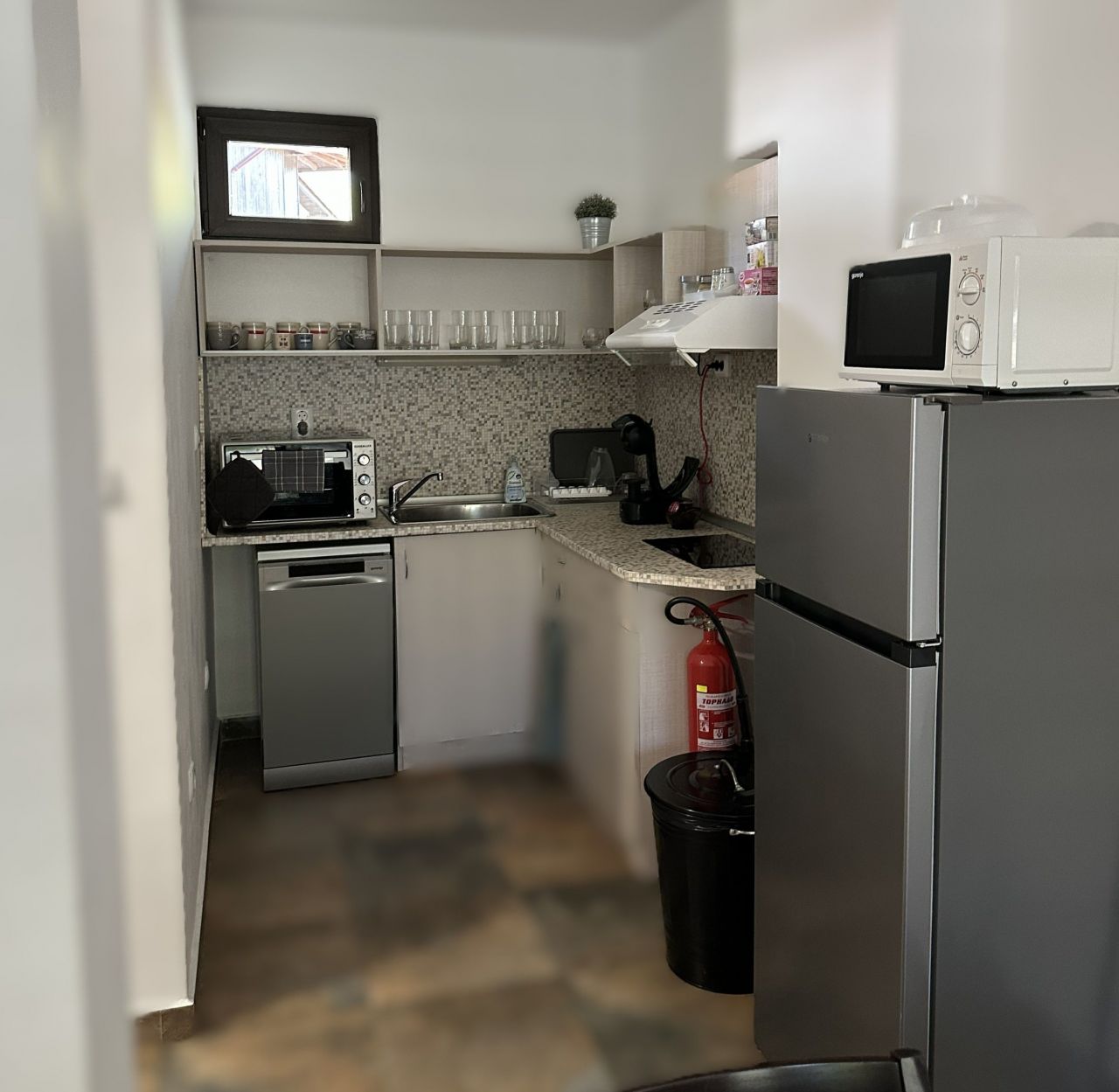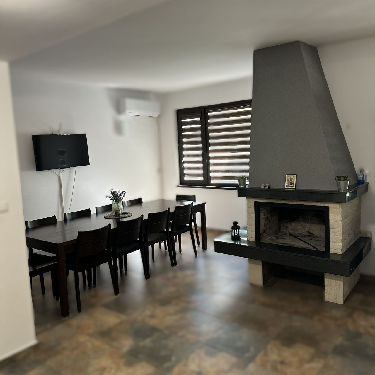 На първия етаж ще откриете просторна трапезария с камина, телевизор с кабелна телевизия и напълно оборудван кухненски бокс, включващ: