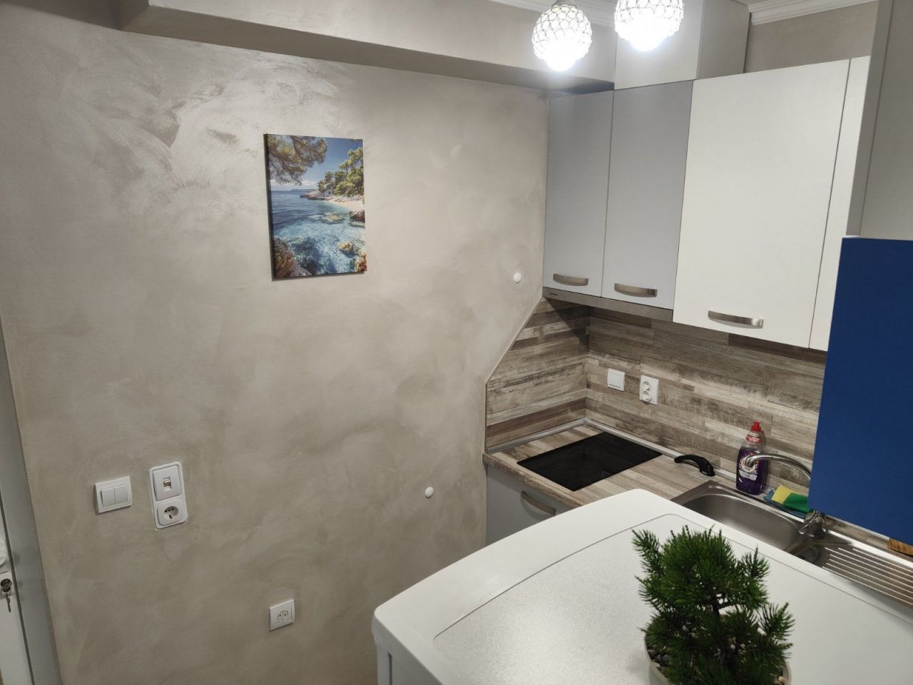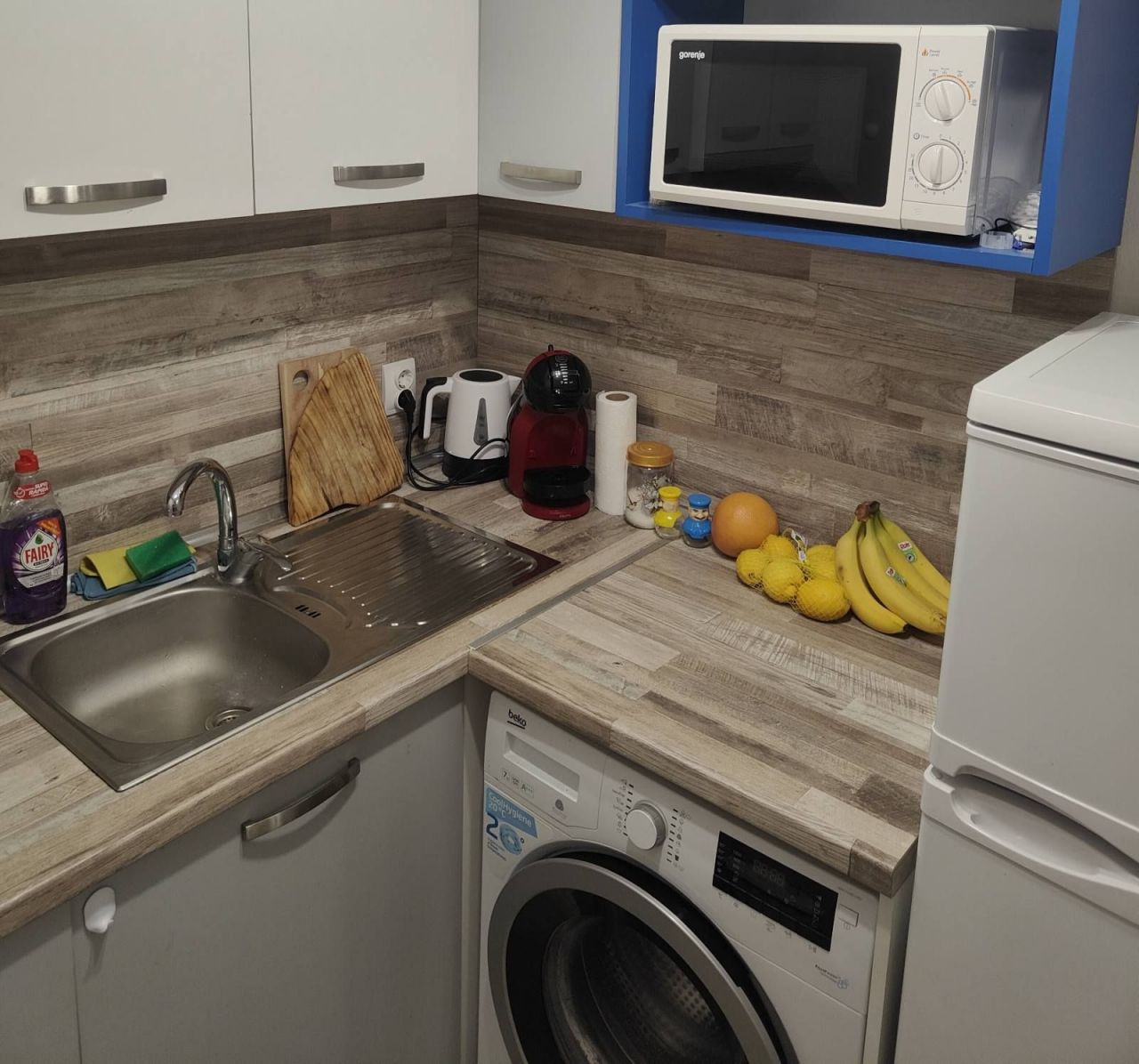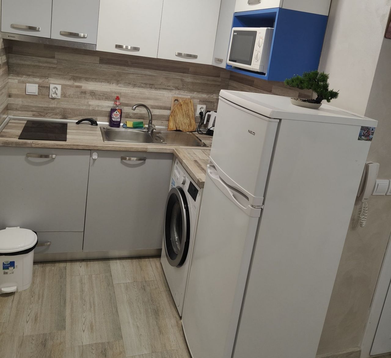 Кухня, която е оборудвана с всичко необходимо (керамичен котлон с тъч сензори, аспиратор, кафе машина, хладилник, пералня, електрическа кана за вода, посуда), спално бельо, хавлии, ютия, две маси, четири стола.