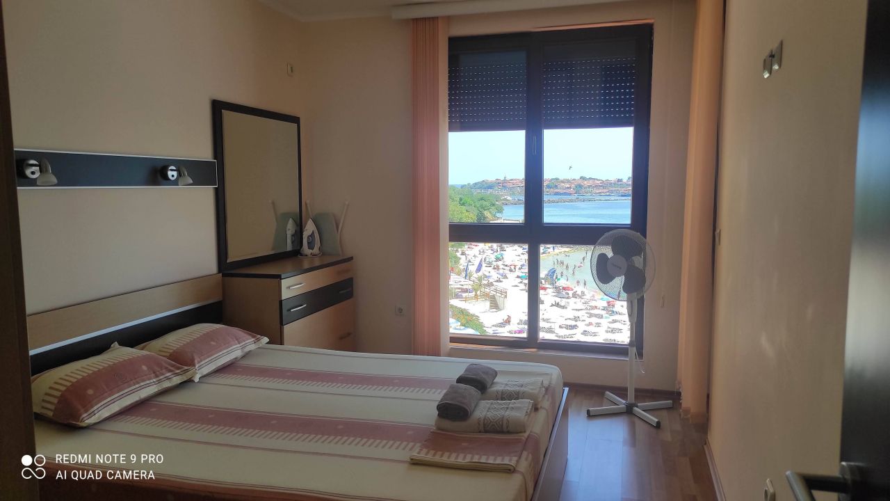 Уютен и комфортен двустаен апартамент в комплекс Мираж, разположен на брега на Южния плаж, с тераса над пясъка и невероятен изглед към морската шир, плажа, Стария Несебър и яхтеното пристанище.
