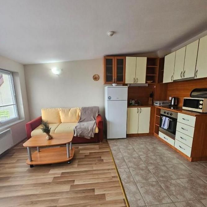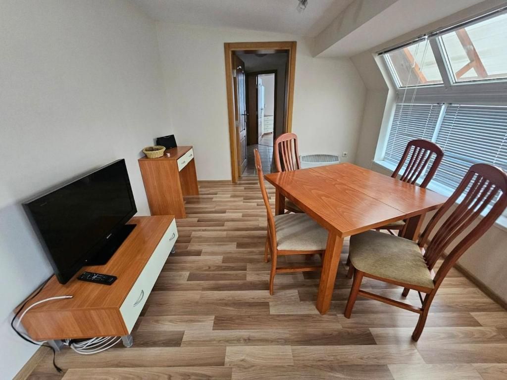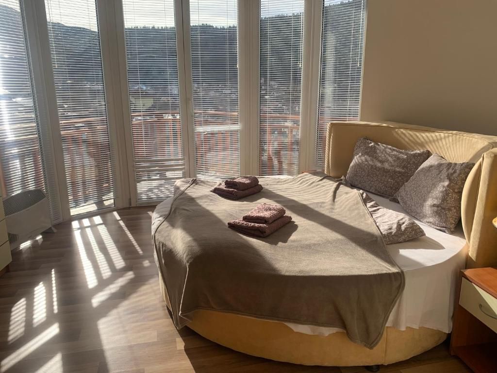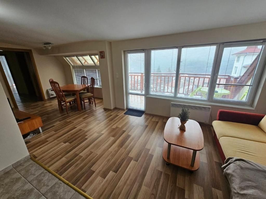 Апартаментът (53 кв. м) е разположен на последния етаж и предлага впечатляваща панорамна гледка към планината. Просторната дневна е изпълнена с естествена светлина, а през прозорците се разкрива красотата на заобикалящата природа.