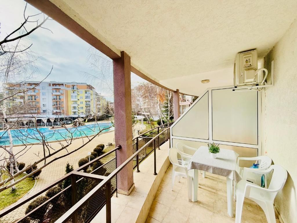 Добре дошли в нашия очарователен тристаен апартамент с две спални и прекрасна гледка към басейн, разположен в затворения комплекс Сън Вилидж в сърцето на Слънчев бряг.