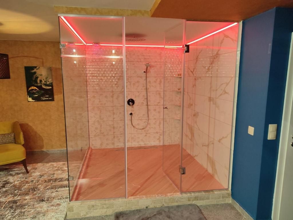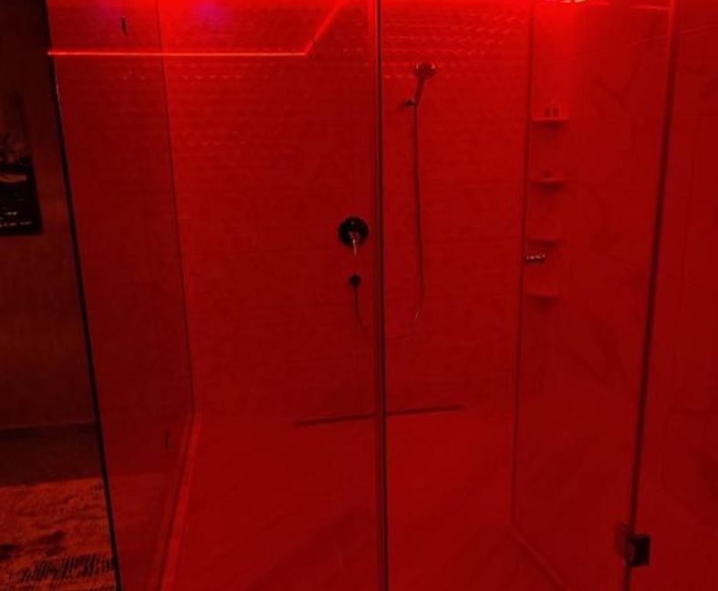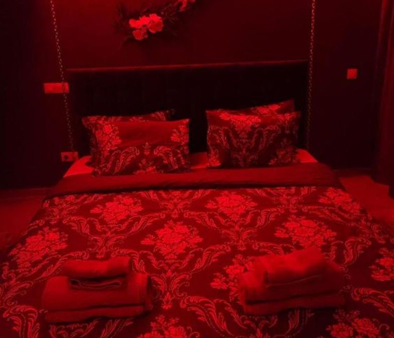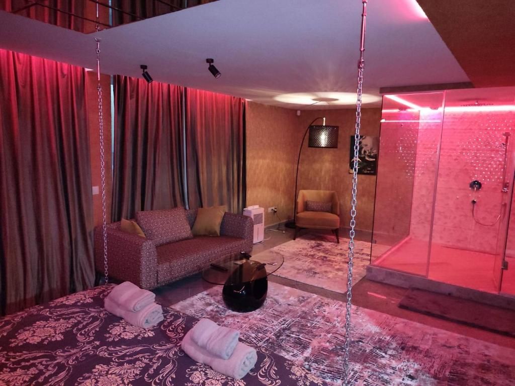 Смел интериор с прозрачна баня, люлеещо се легло и огледало на тавана.