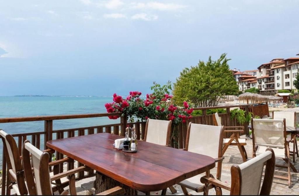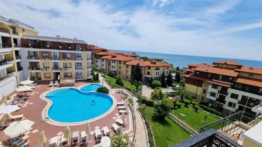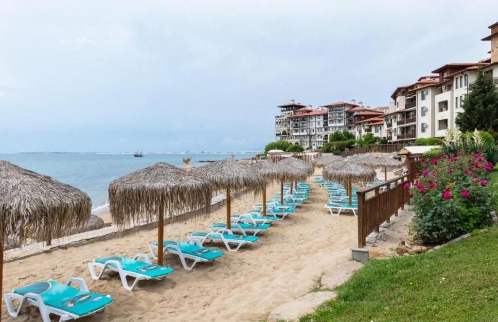 Прекрасен ваканционен апартамент (68 кв. м) в к-с Райска градина, на първа линия до плажа в Св. Влас, с красив изглед към морето и басейните в комплекса.