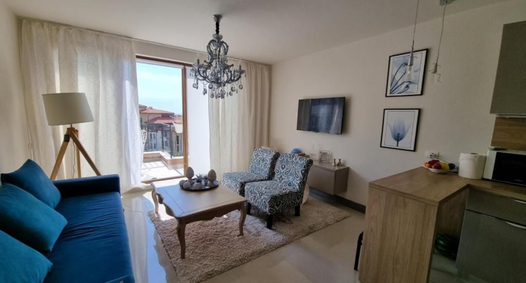 Състои се от просторна всекидневна с комфортен разтегателен диван, подходящ за двама гости, напълно оборудвана кухня, спалня с удобно двойно легло, елегантна баня с вана и тоалетна, и панорамна тераса.