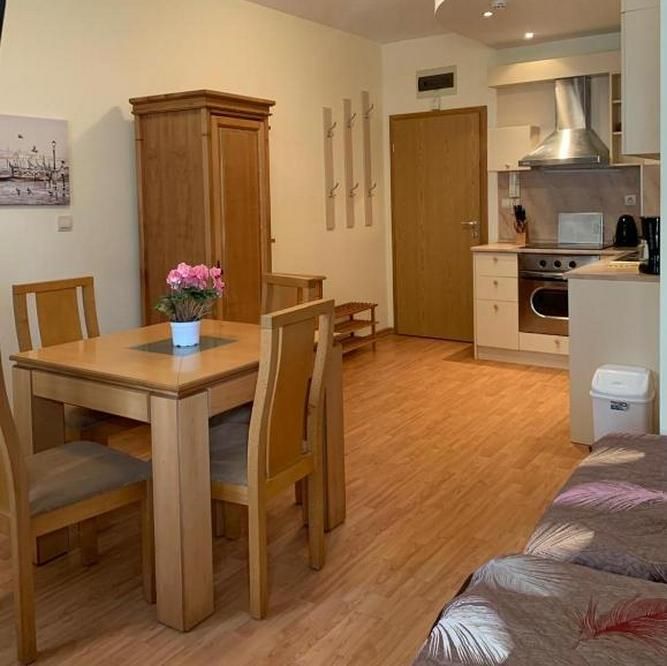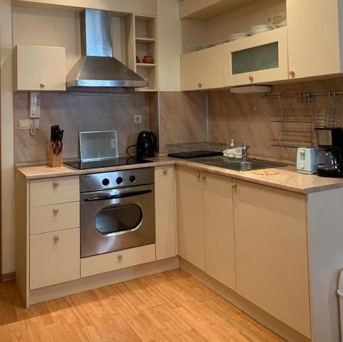 - напълно оборудван кухненски бокс (фурна; индукционни котлони; кафемашина; тостер; хладилник, прибори и посуда);