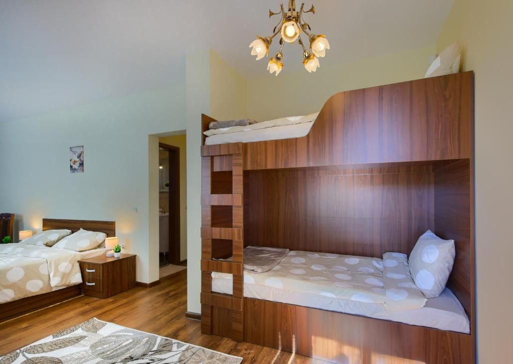- 1 фамилна стая, подходяща за семейство с 2 деца - просотрно помещение с голямо двойно легло и едно двуетажно легло.