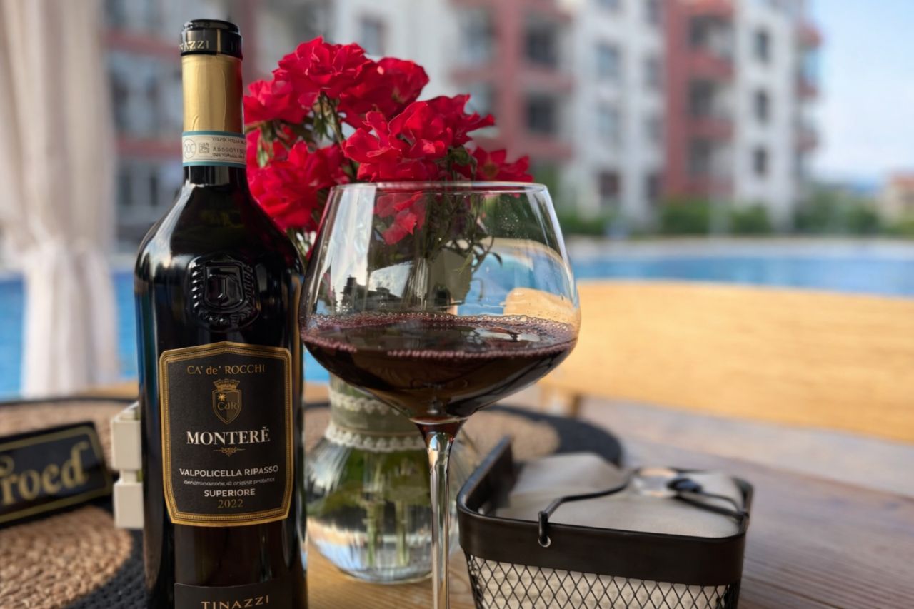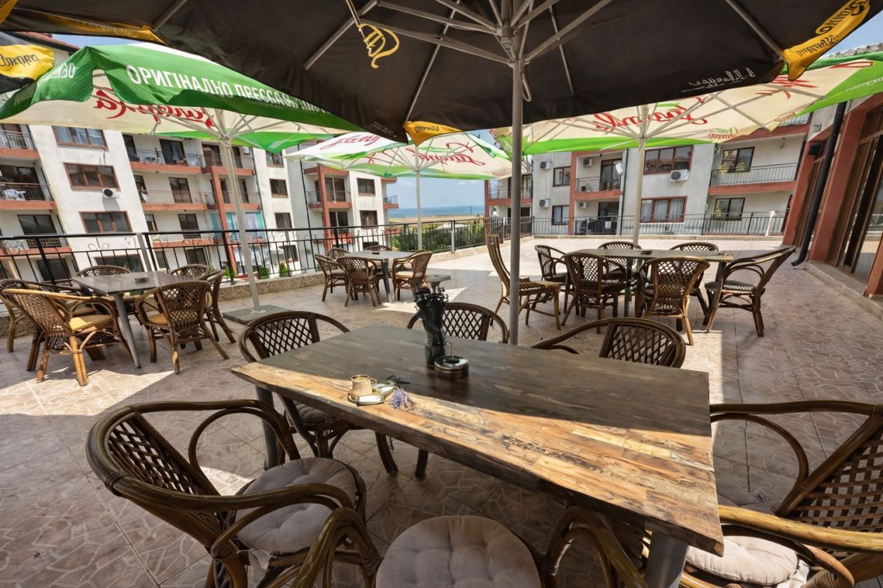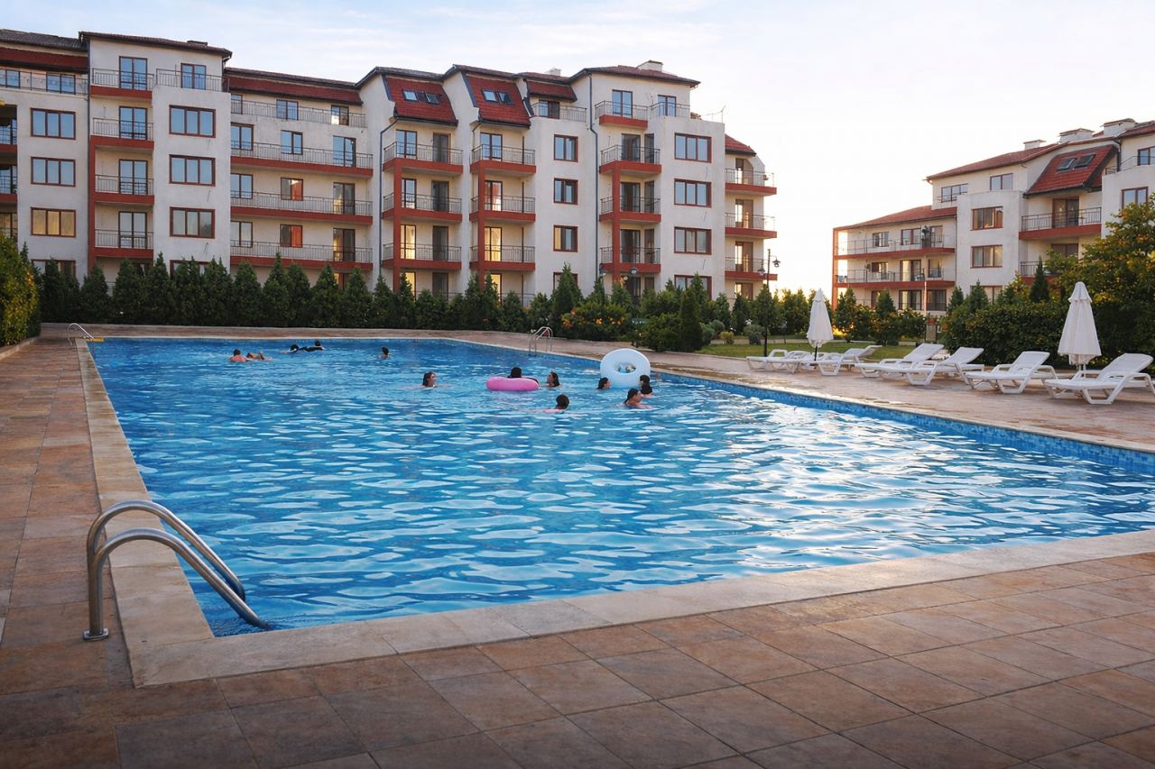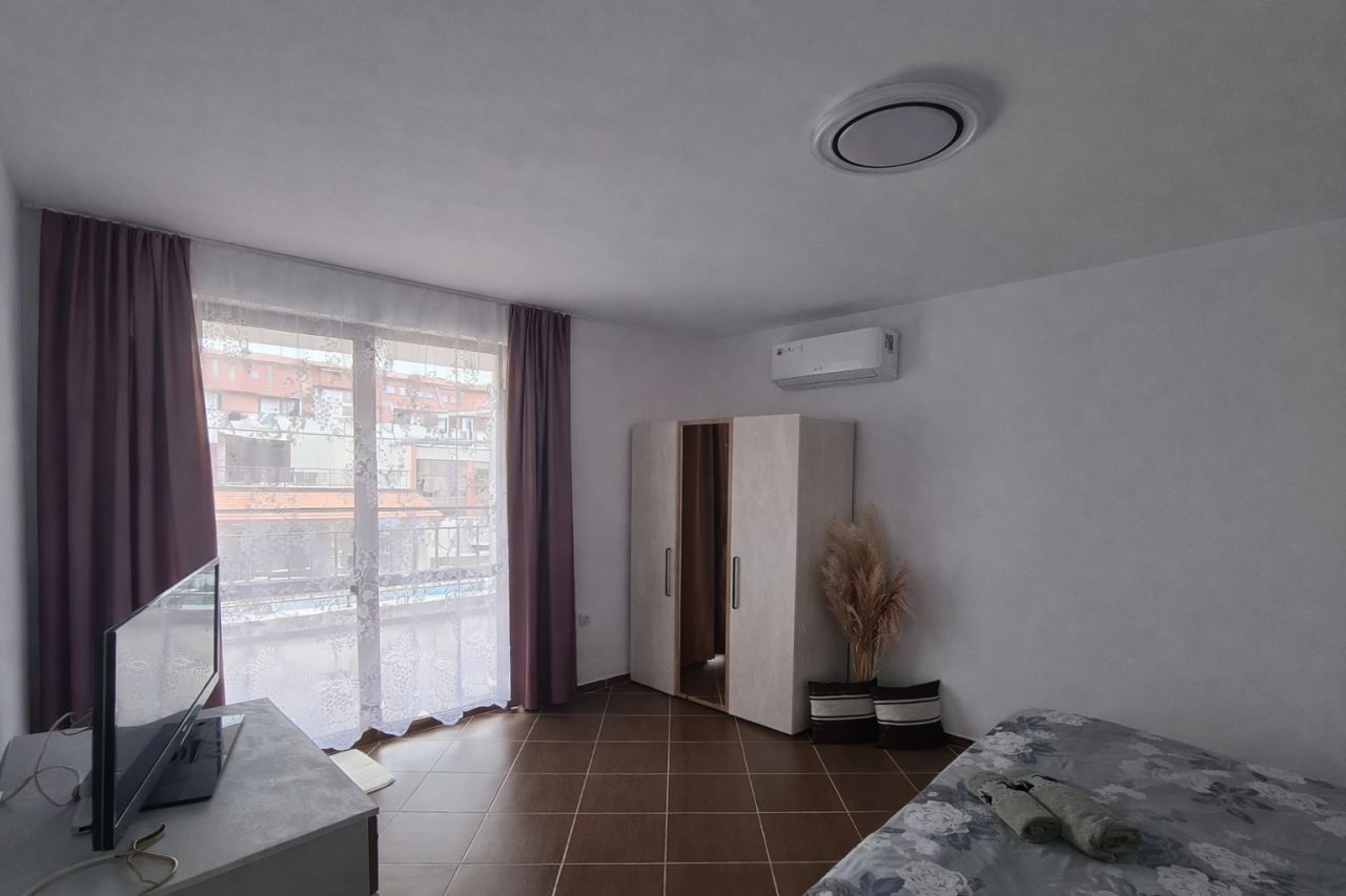 Уютен апартамент с просторна тераса и директен изглед към голям басейн.