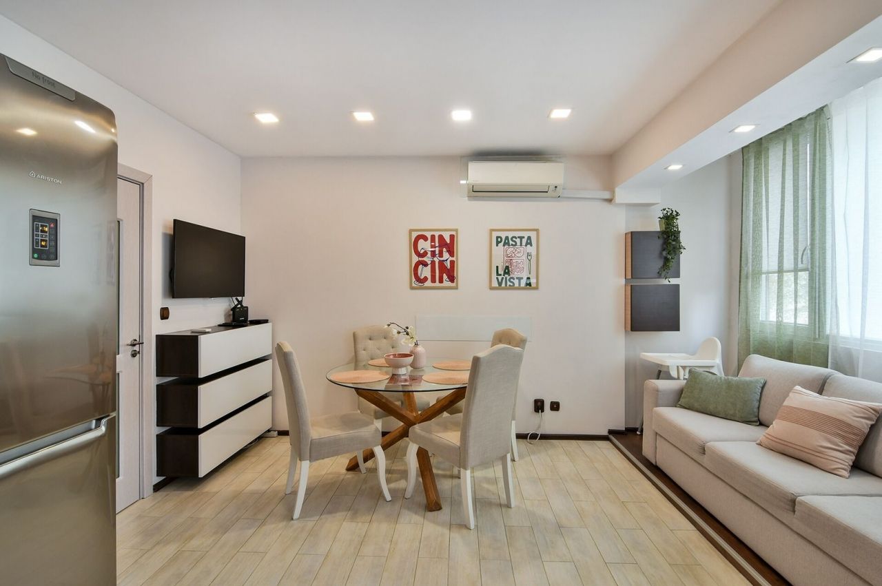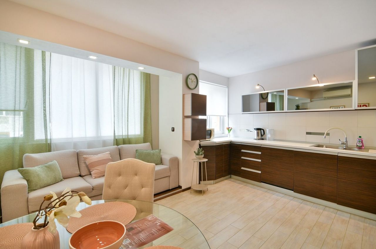 Модерен апартамент (95 кв. м) с две спални, светъл хол и напълно оборудвана кухня – перфектен за хора, които търсят комфорт и стил по време на своята почивка.