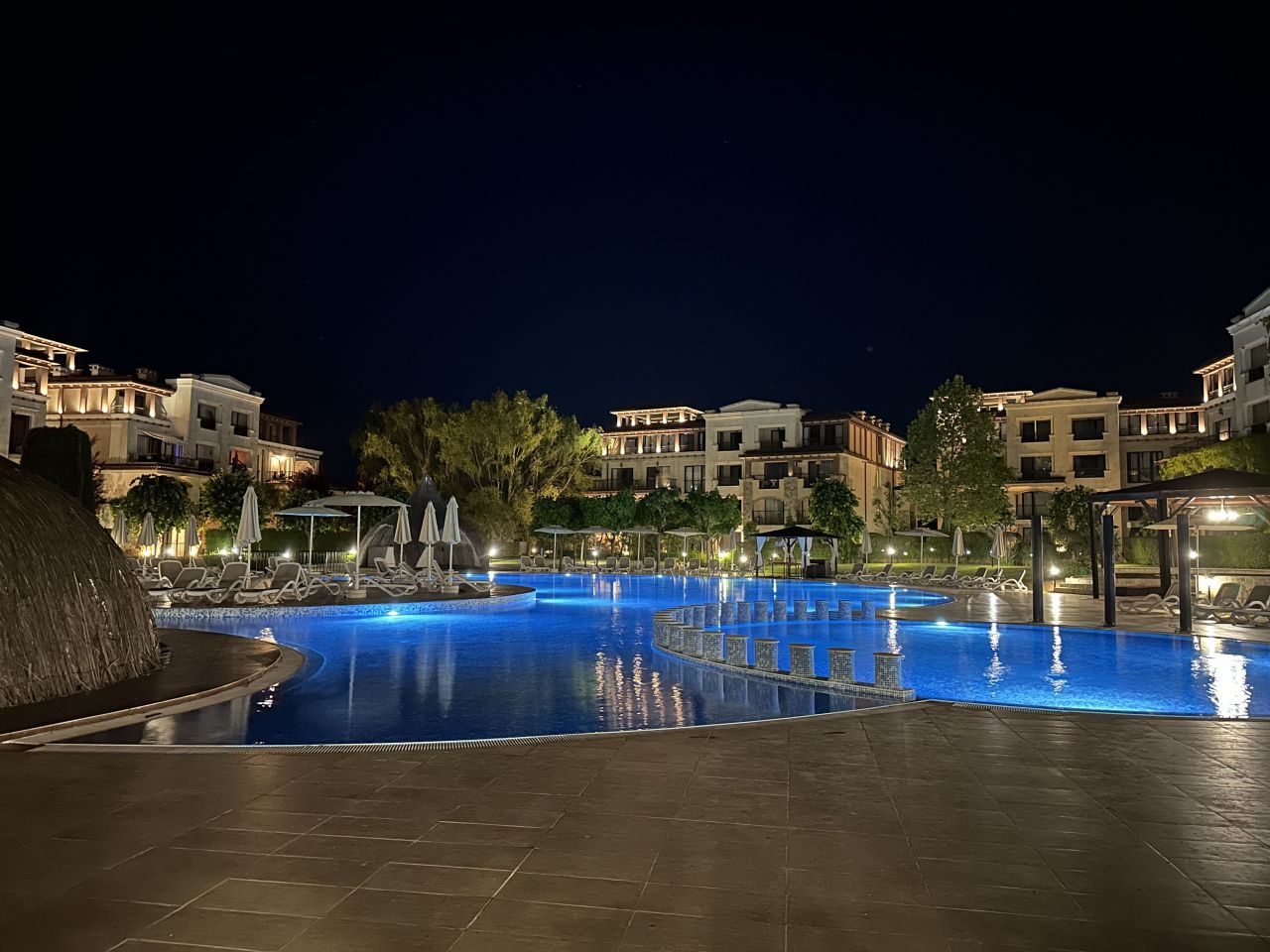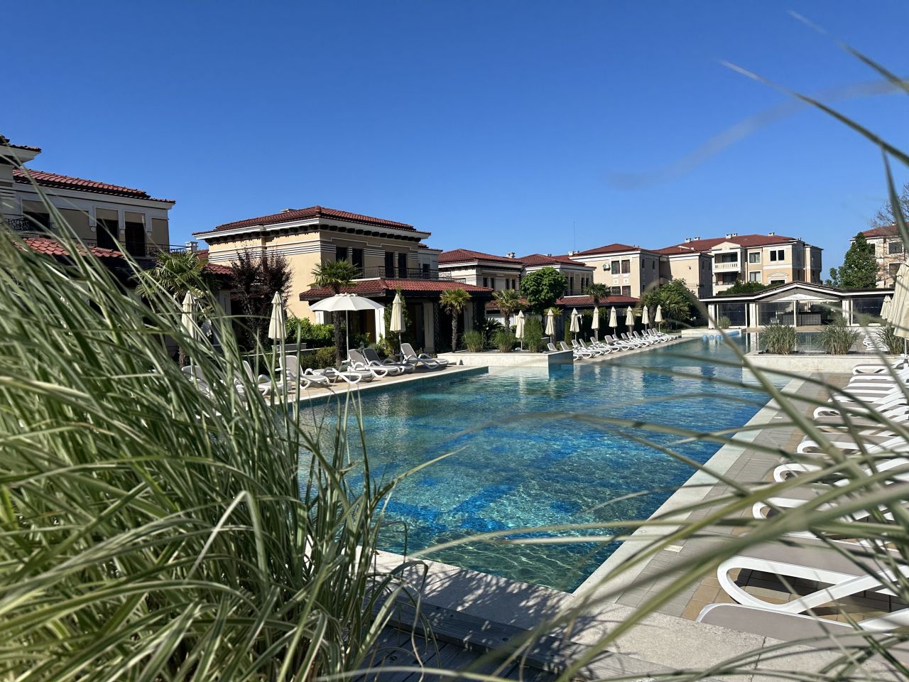 - Тераса с уютен кът за отдих и гледка към един от басейните.