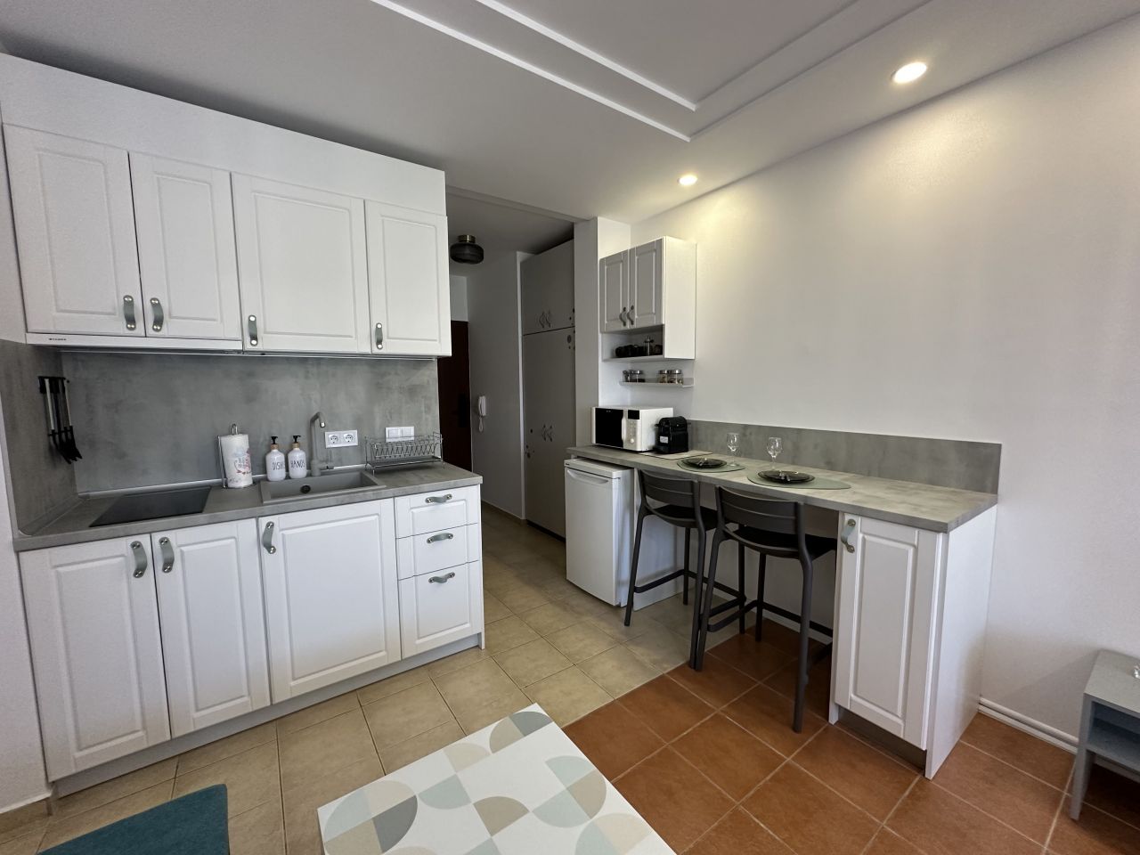 - Оборудвана кухня: котлони, микровълнова с грил функция, кафе машина с консумативи, тостер, кана за топла вода и пълна посуда