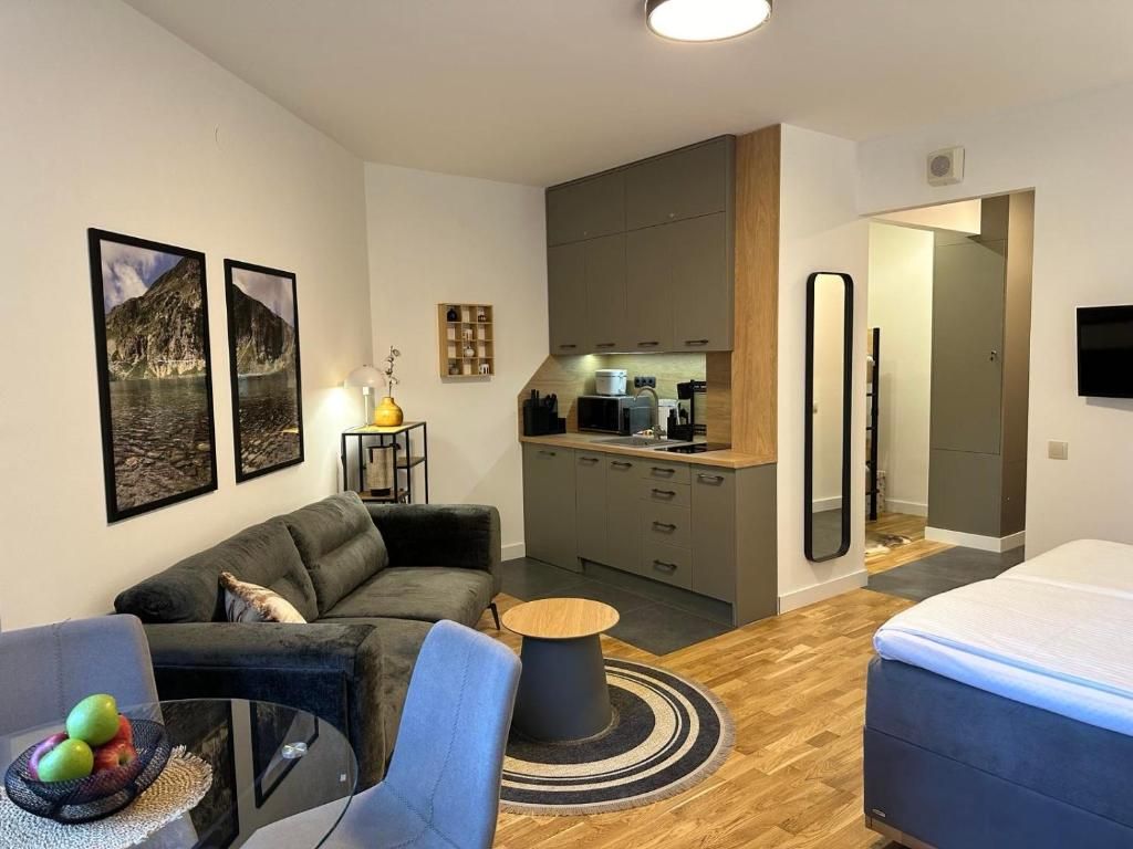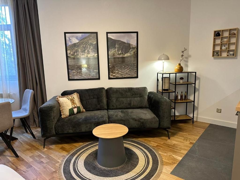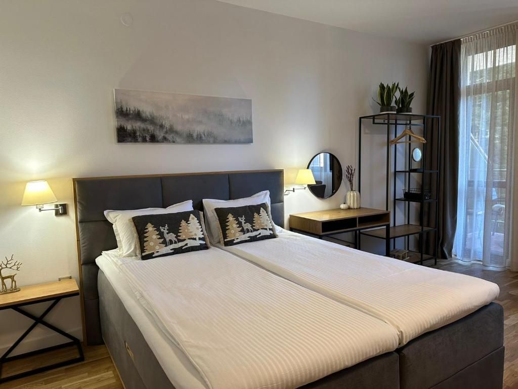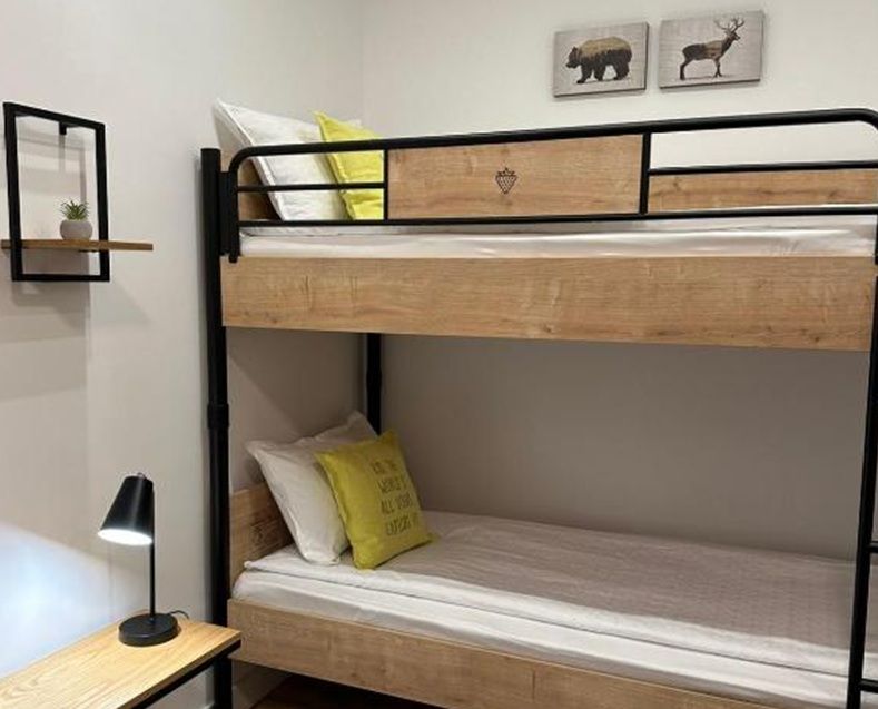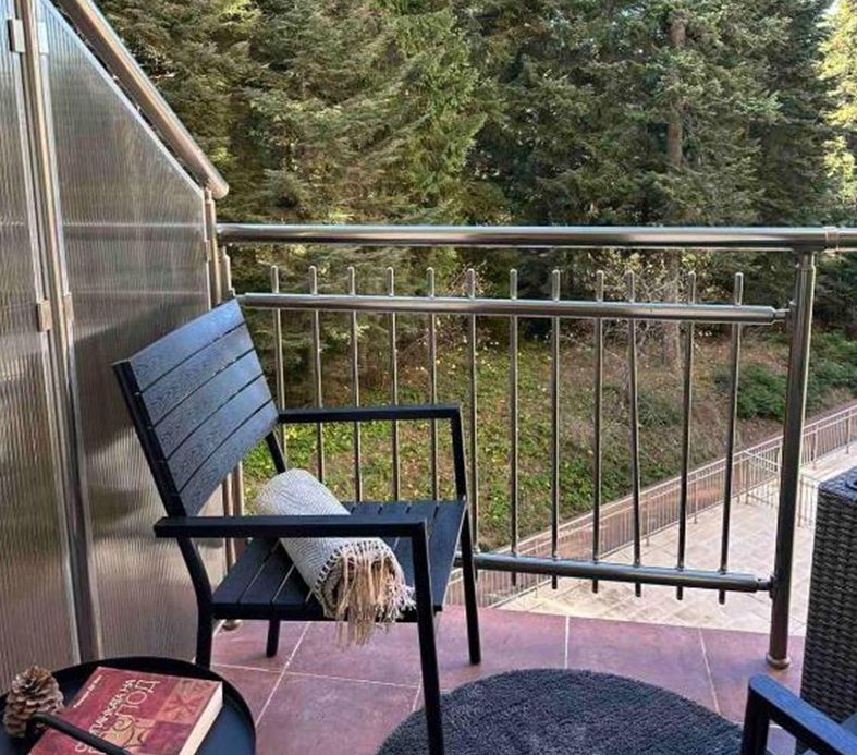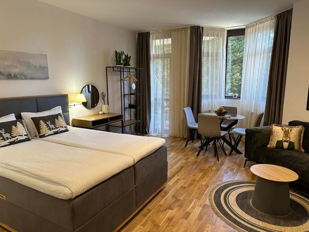 Апартаментът разполага с всички необходими удобства за вашия спокоен и комфортен престой: оборудвана кухня, зона за хранене с трапезна маса, просторна баня с душ пространство, кът за сядане с мека мебел и телевизор с плосък екран, дъбова подова настилка и балкон с гледка към боровата гора.