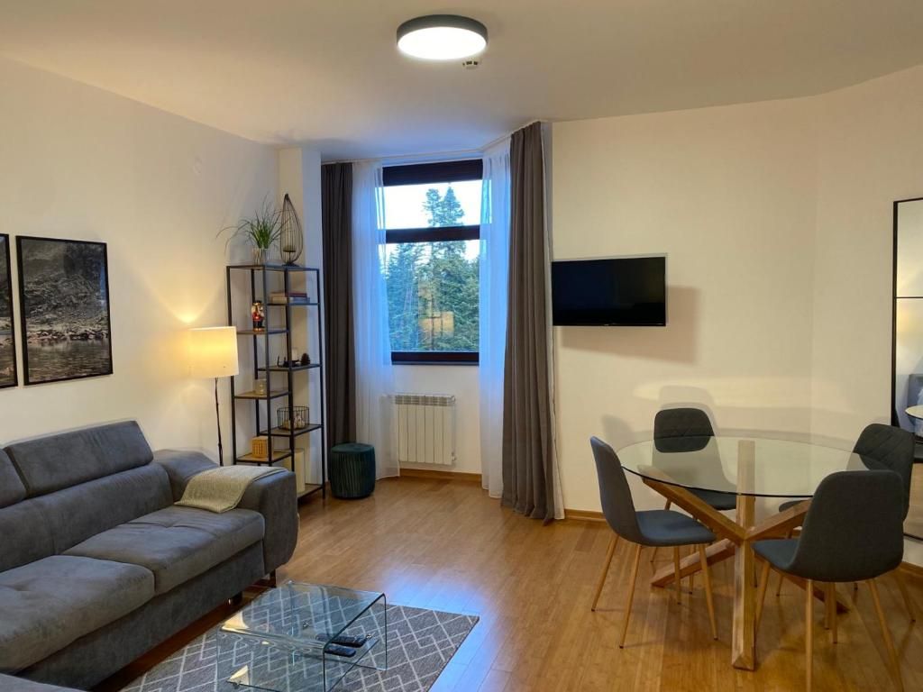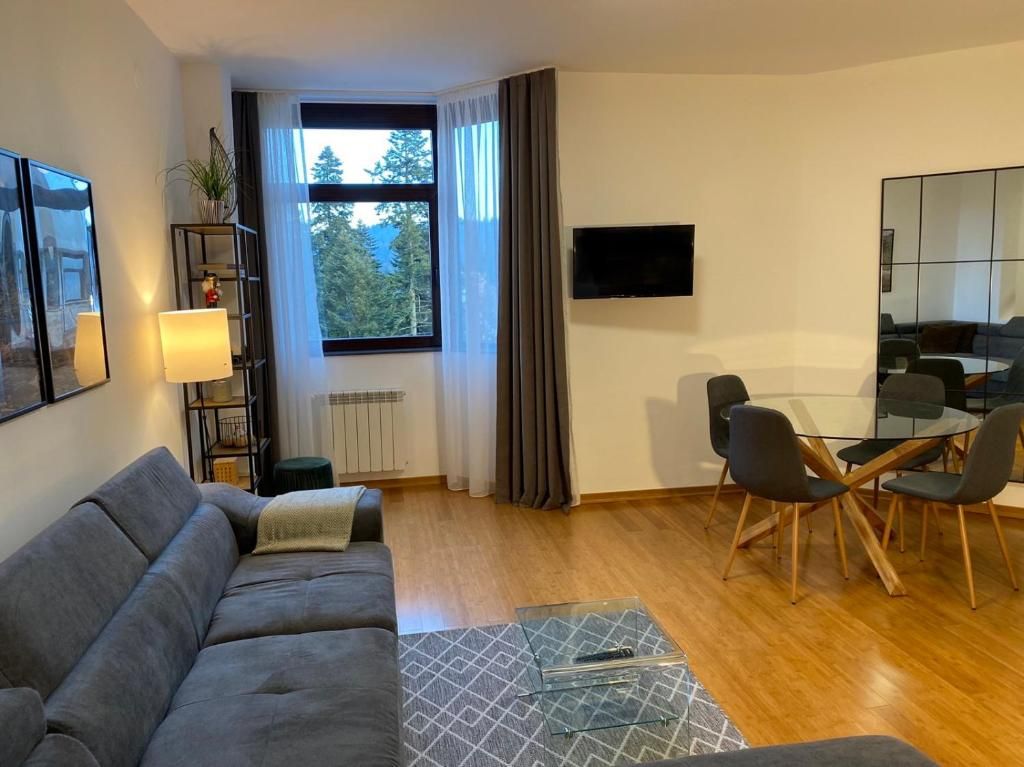 Апартаментът разполага с всички необходими удобства за вашия спокоен и комфортен престой: оборудвана кухня, зона за хранене с трапезна маса, просторна баня с екстра голямо душ пространство, кът за сядане с мека мебел и телевизор с плосък екран, бамбукова подова настилка и гледка към пистите.