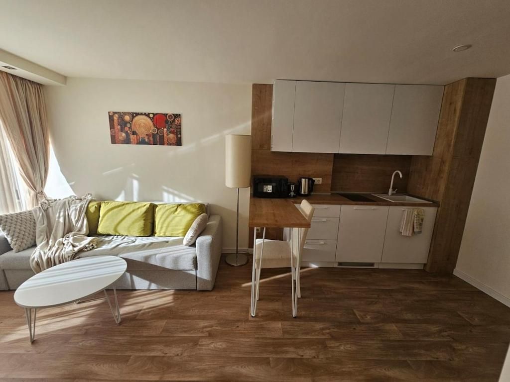 Апартаментът разполага с просторен хол с прозорци, които изпълват помещението с естествена светлина. Удобният диван и меките тонове на интериора създават усещане за домашен уют и релакс.