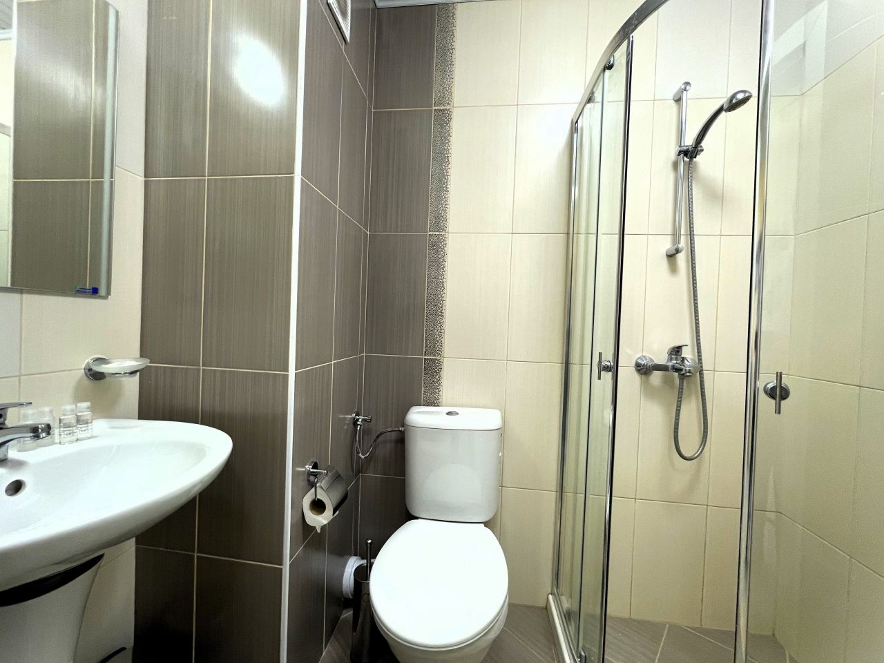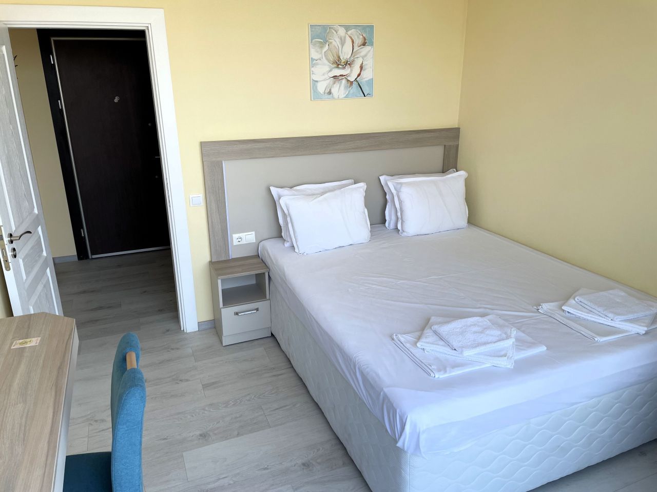 Предлагаме и двойни стаи с централна гледка към морето с тераса. Всяко от студиата има самостоятелен санитарен възел, мини кухня с микровълнова и телевизор.