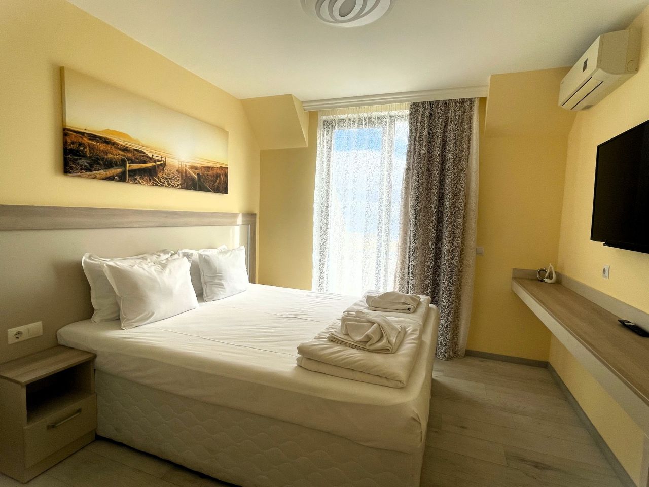 Всички помещения са климатизирани. Спалните са оборудвана с двойно легло 200/180 см с удобен матрак и безжичен интернет.