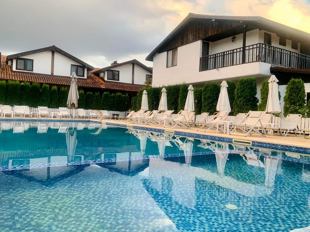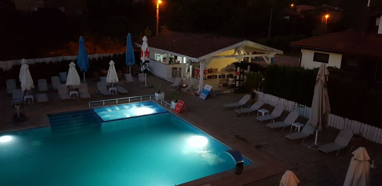 Комплексът разполага с външен басейн, който е с размери 15/7 метра и дълбочина от 120/150 см. Предвидили сме отделно обособен басейн за деца с дълбочина 60 см, както и хидромасажна зона като част от общия басейн с дълбочина 90 см. Пространството около водната зона е решено чрез комфортни шезлонги, масички и чадъри. Към басейна функционира летен бар, където нашите клиенти могат да си поръчат освежителни напитки и вкусни закуски.