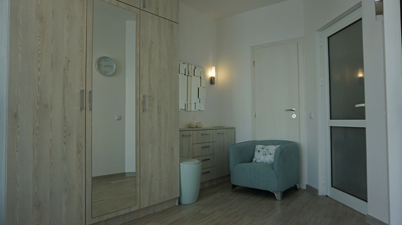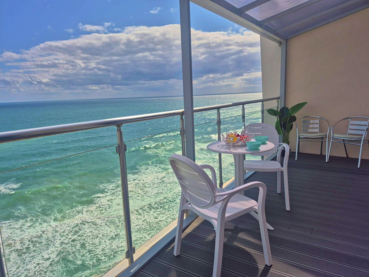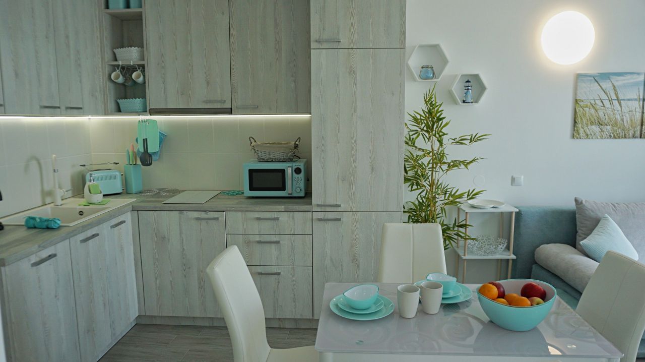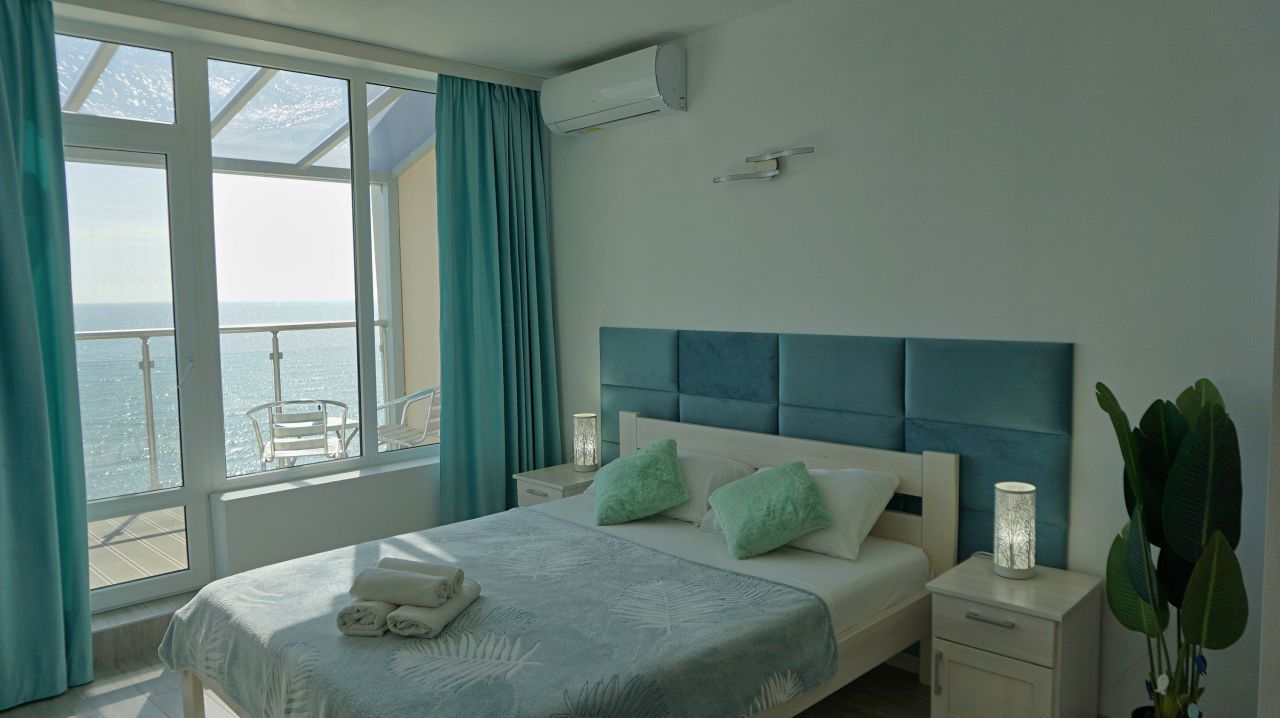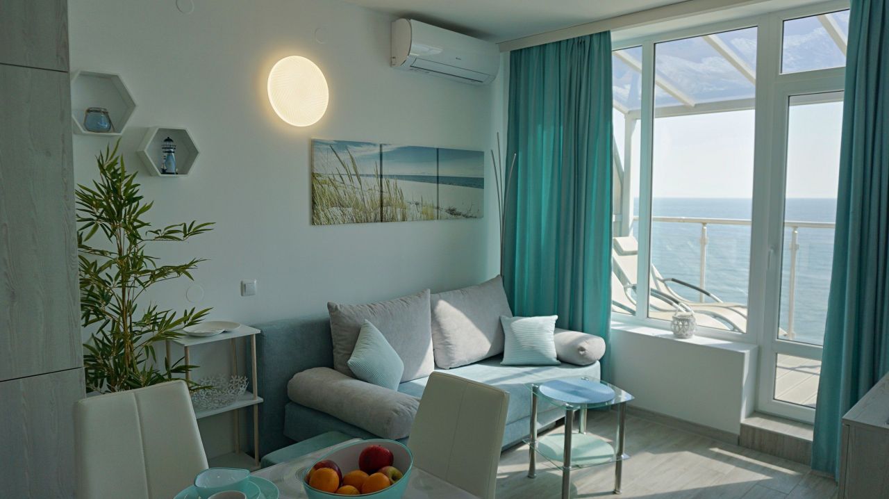 Апартаментът е снабден с климатик в хола и в спалнята, което гарантира желаната степен на комфорт през горещите дни. Тераса с невероятна фронтална морска гледка, оборудвана с маса и столове, шезлонг, където можете да се насладите на нежния морски бриз, пиейки сутрешното си кафе или вечерния си коктейл.