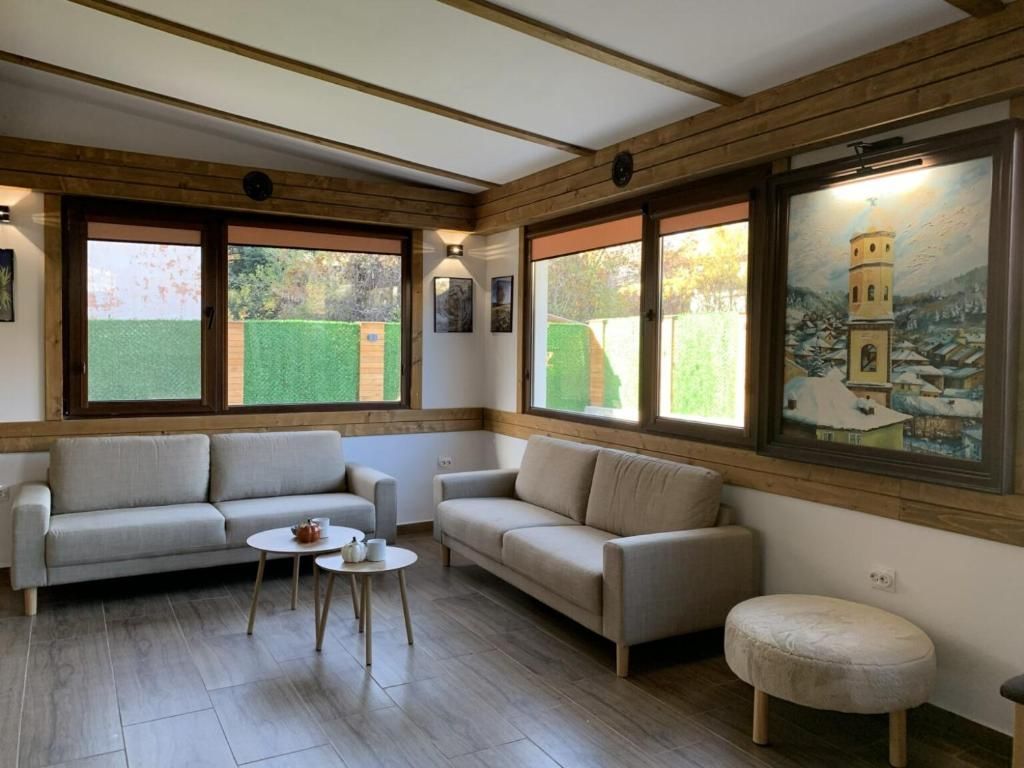 - Просторна всекидневна с дивани и маса за хранене, телевизор, камина за отопление и климатик.