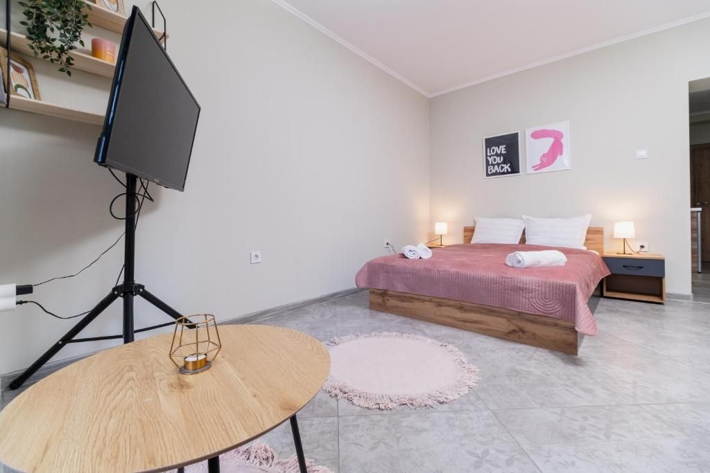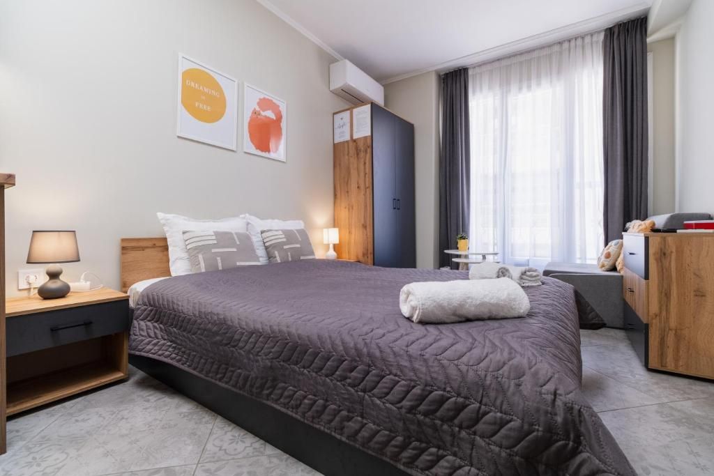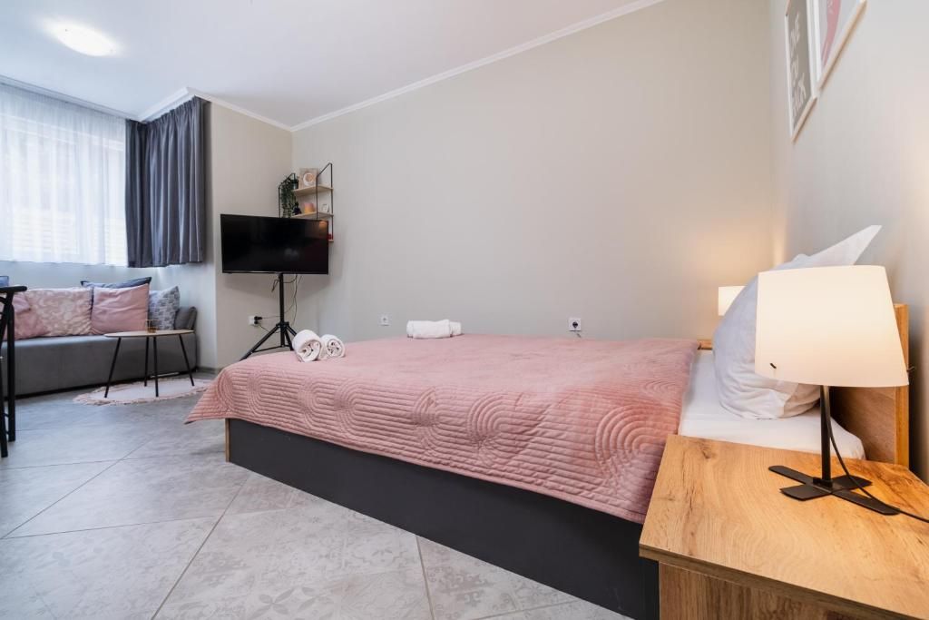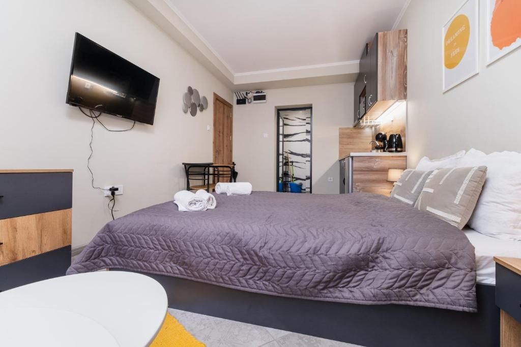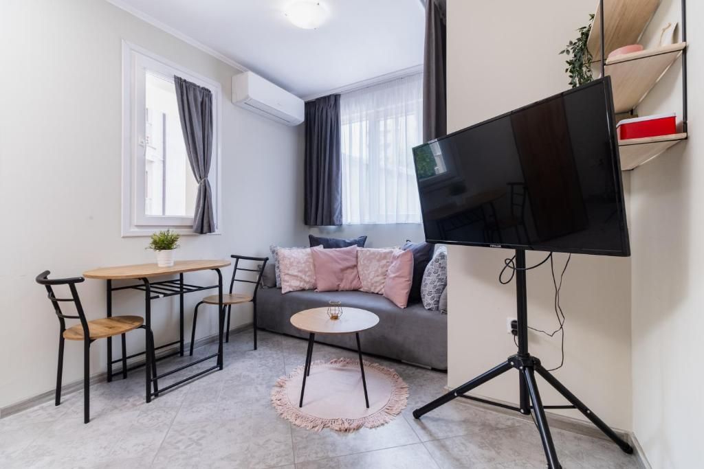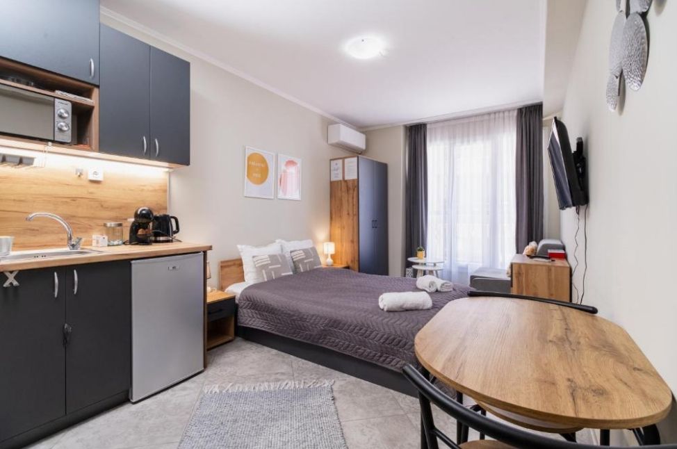 Студиата разполагат с уютна обстановка, подходяща за почивка след дългия ден из града. Пространството е оборудвано с всичко необходимо за вашето удобство, включително удобно място за сядане, телевизор с плосък екран и напълно оборудвана кухня.