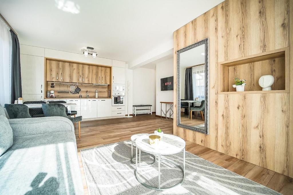 - всекидневна зона с удобен разтегателен диван, масичка за кафе, кът за хранене с трапезна маса и столове и напълно оборудвана кухня (вкл. пералня, кафемашина и съдомиялна);