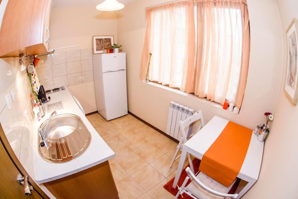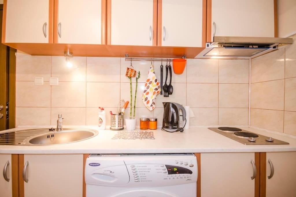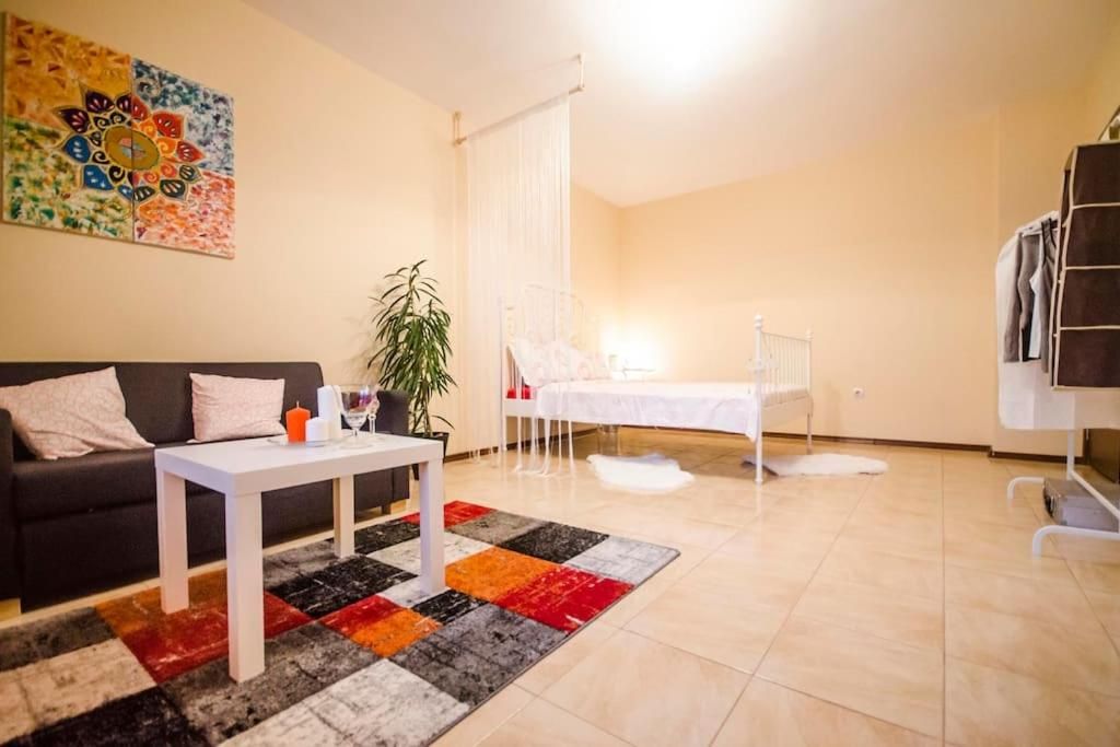 Жилището е уютно обзаведено и предлага всичко необходимо за комфортен престой - напълно оборудвана кухня, просторна всекидневна, в която има голямо удобно легло, диван и телевизор, тераса с гледка към града и санитарен възел.
