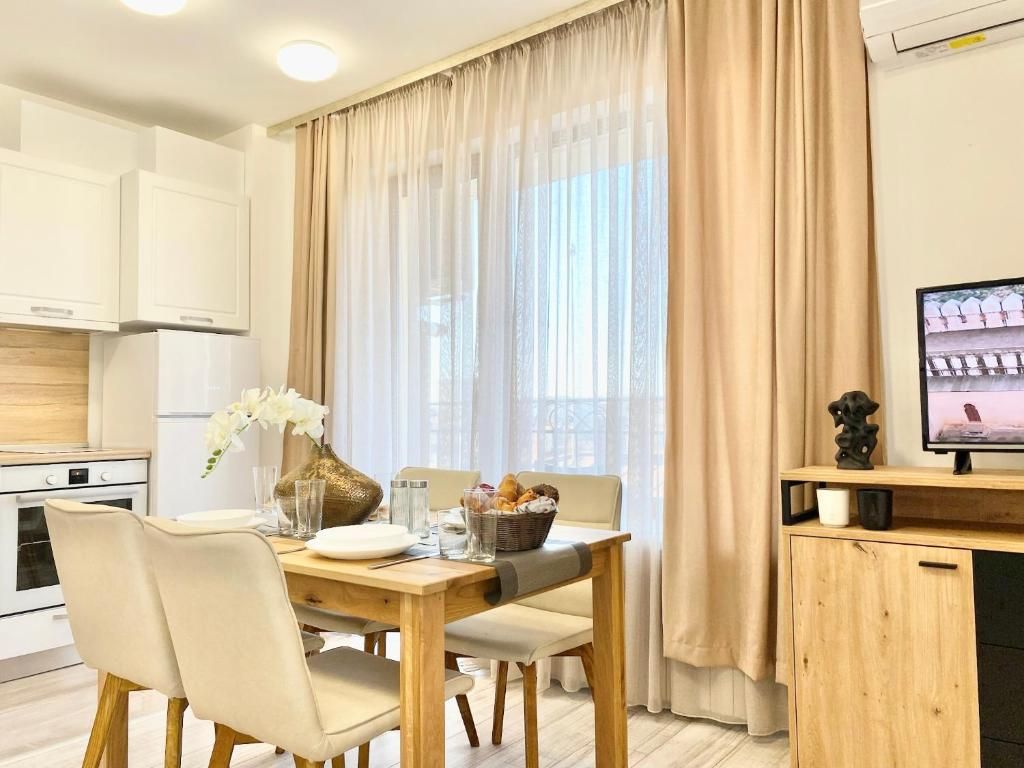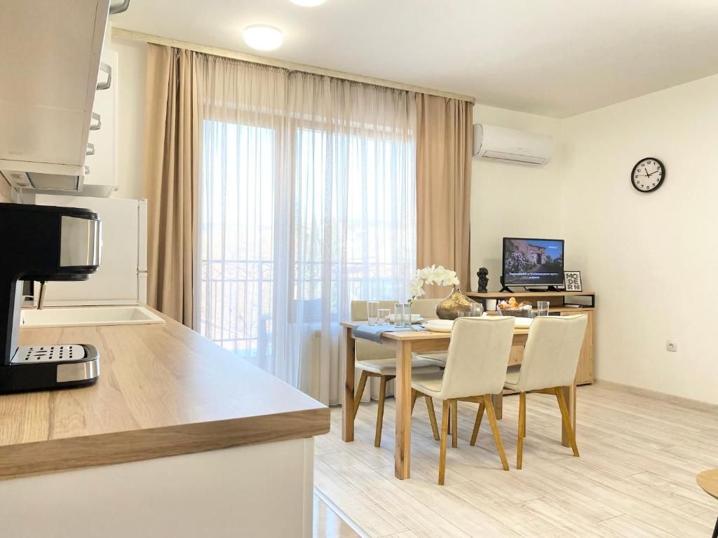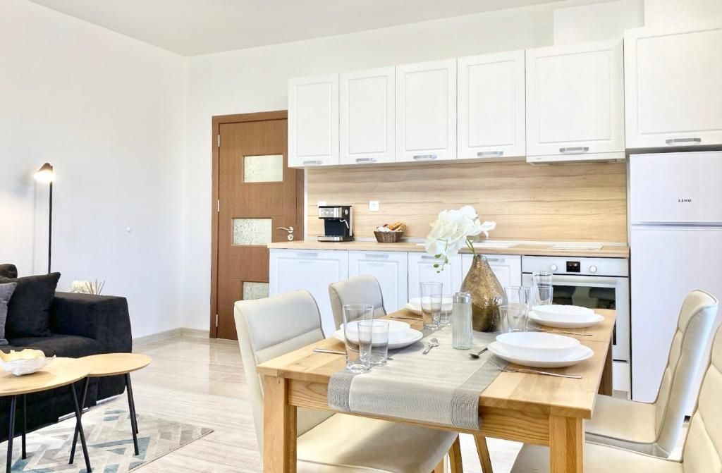 Жилището е климатизирано и разполага с просторна всекидневна с разтегателен диван, оборудван кухненски бокс и кът за хранене, една спалня, тераса и санитарен възел.