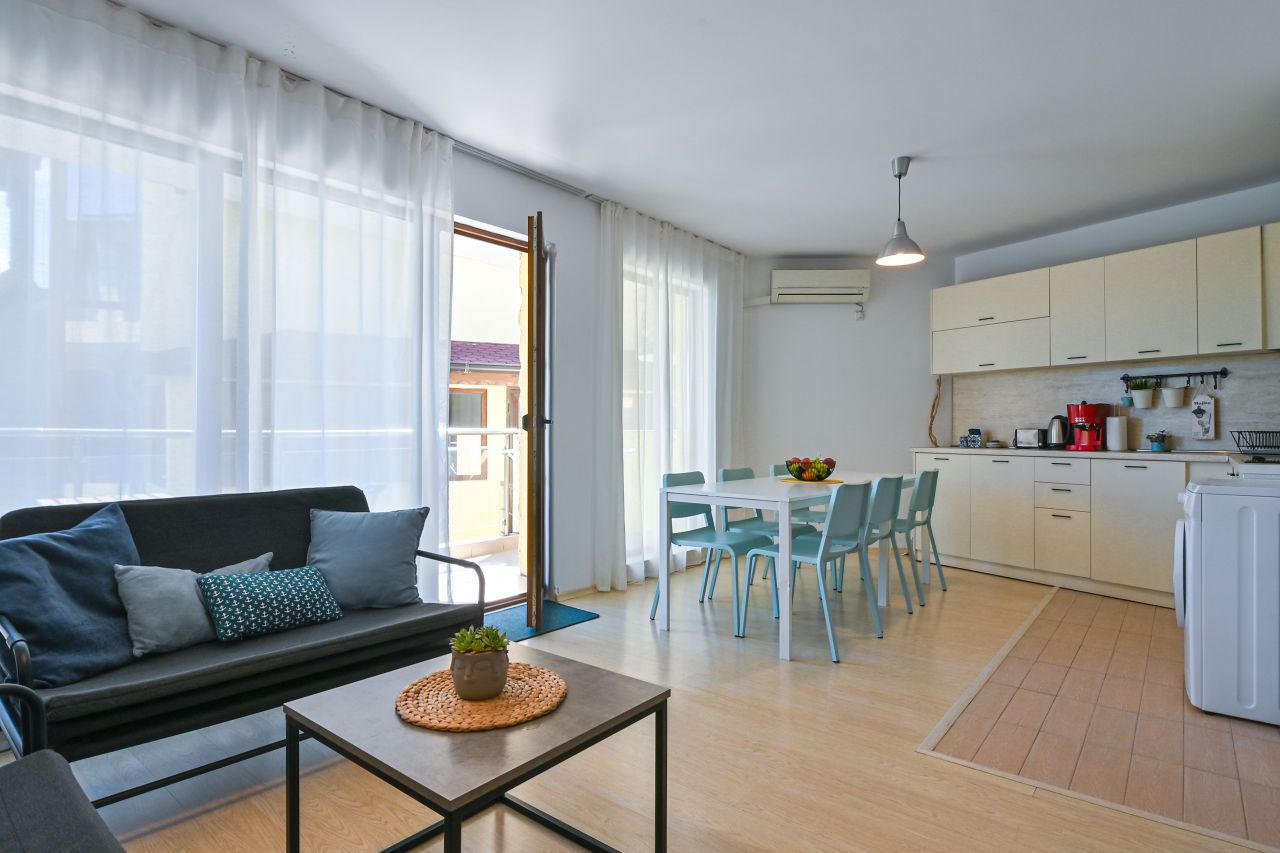 - Предлагаме комфортно настаняване за по-големи групи и в същото време уединение: мезонетите са свързани, разполагат с общо 4 спални, 4 бани, разтегателни дивани в хола, климатици във всяка стая, кабелна телевизия и Wi-Fi.