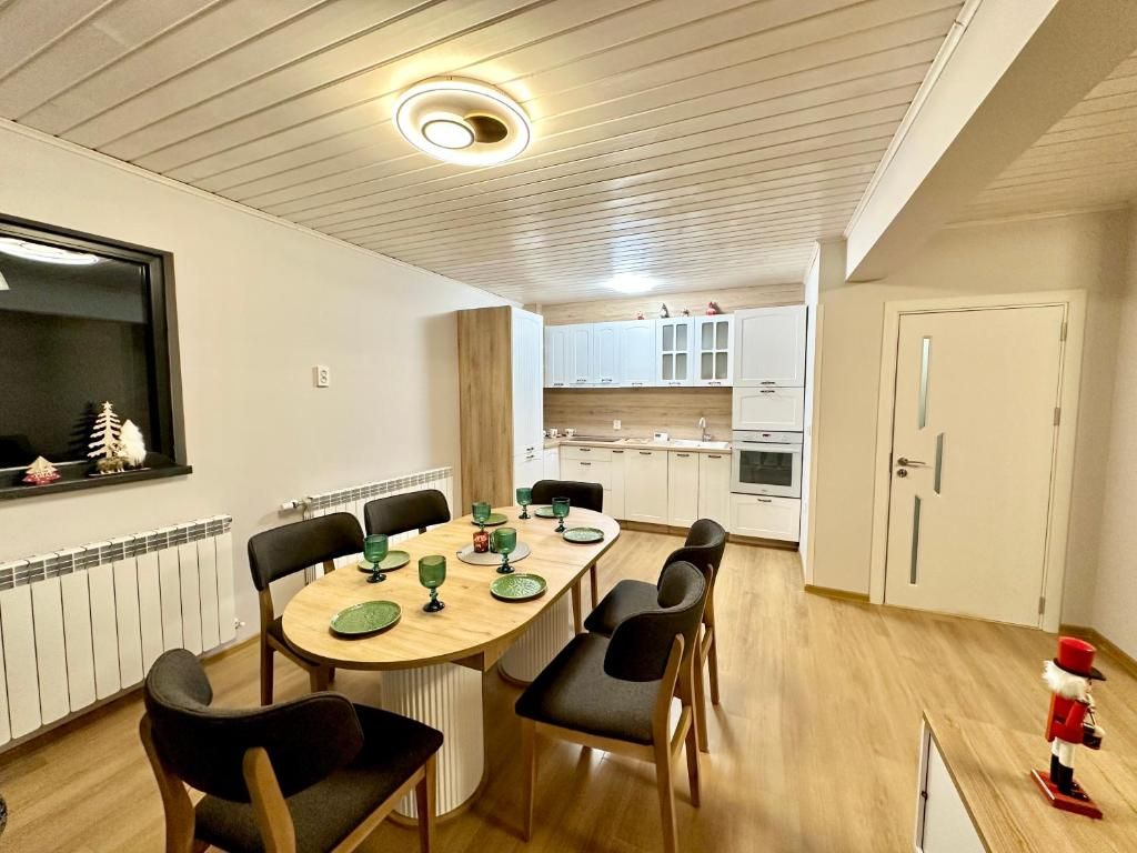 На разположение на гостите са просторен хол, с комфортна мека мебел и напълно оборудвана модерна кухня с керамични котлони, аспиратор, вградена фурна, съдомиялна, хладилник, кафемашина, 4К телевизор и Wi-Fi интернет.