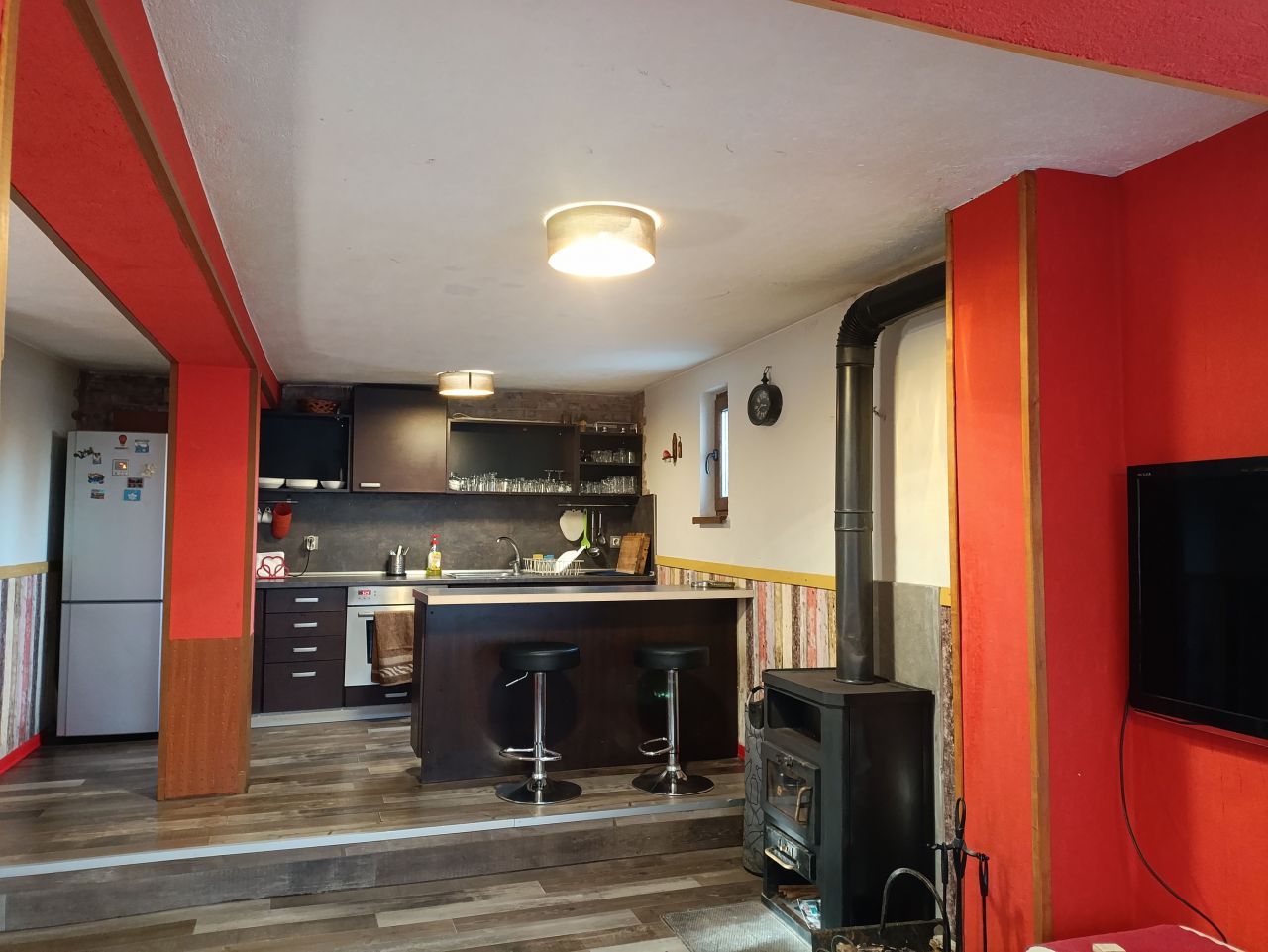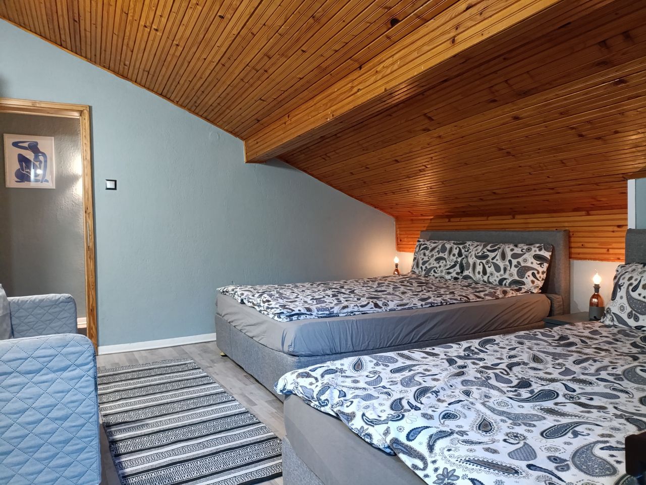 На отделен етаж има още едно самостоятелно помещение тип студио, обзаведено като всекидневна с кухня с разтегателен диван, на който могат да спят спокойно двама човека.