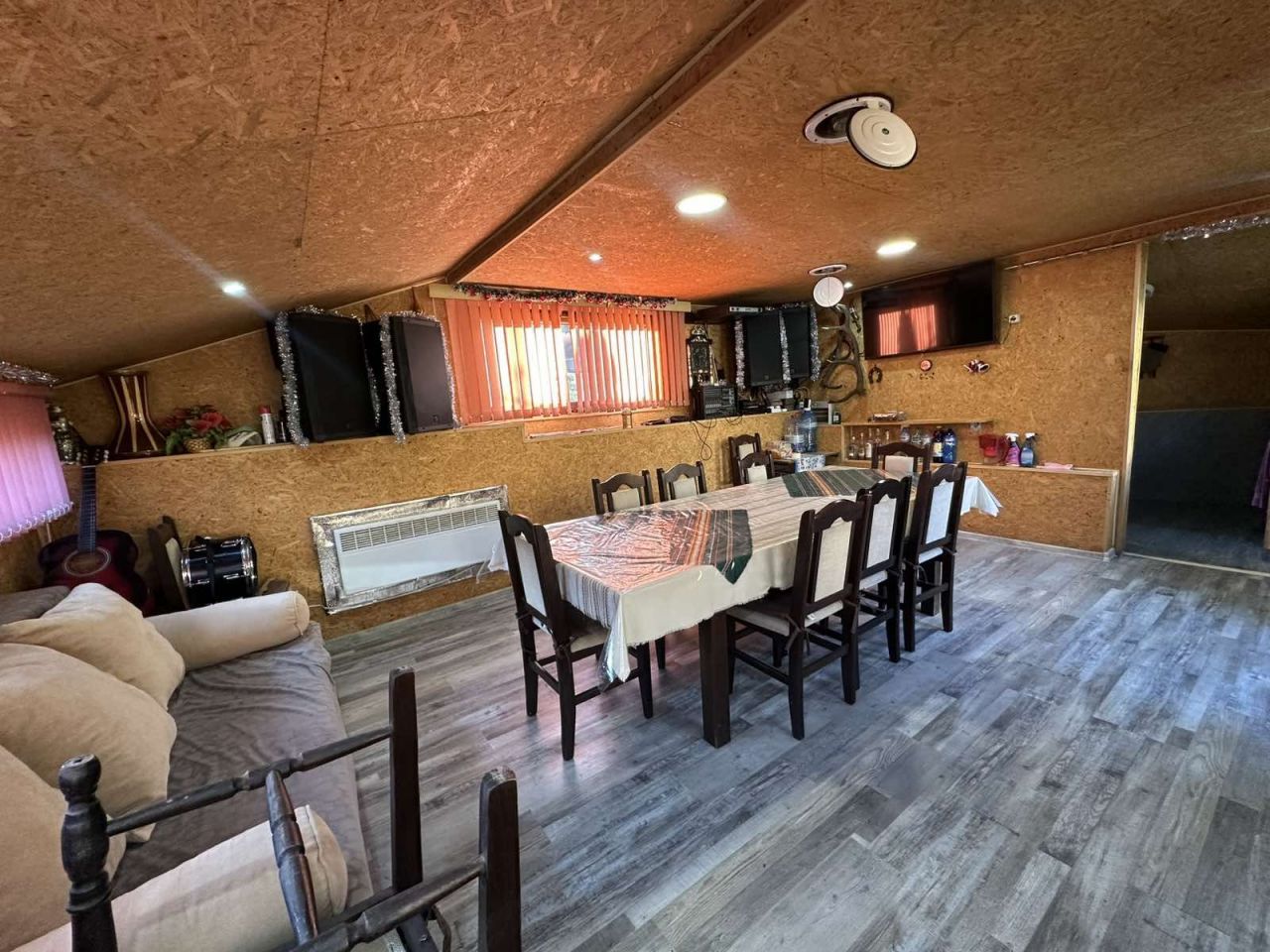 В другата постройка има голяма трапезария с оборудвана кухня, диван, на който също могат да се настанят двама души, плазмен телевизор и аудио система с четири тонколони за весело настроение.