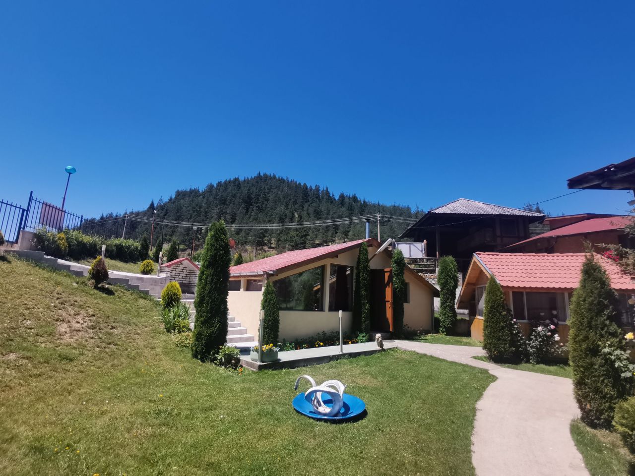 Едната от тях представлява сграда на два етажа. Първият етаж е студио с ъглов хол, който може да се преобразува в легло, оборудвана е с кухня и баня с тоалетна. Студиото разполага с конвектор, голям плазмен телевизор, пералня и съдомиялна. На втория етаж се намират 4 стаи (3 двойни и 1 за четирима) за настаняване, всяка от която е със собствен санитарен възел.