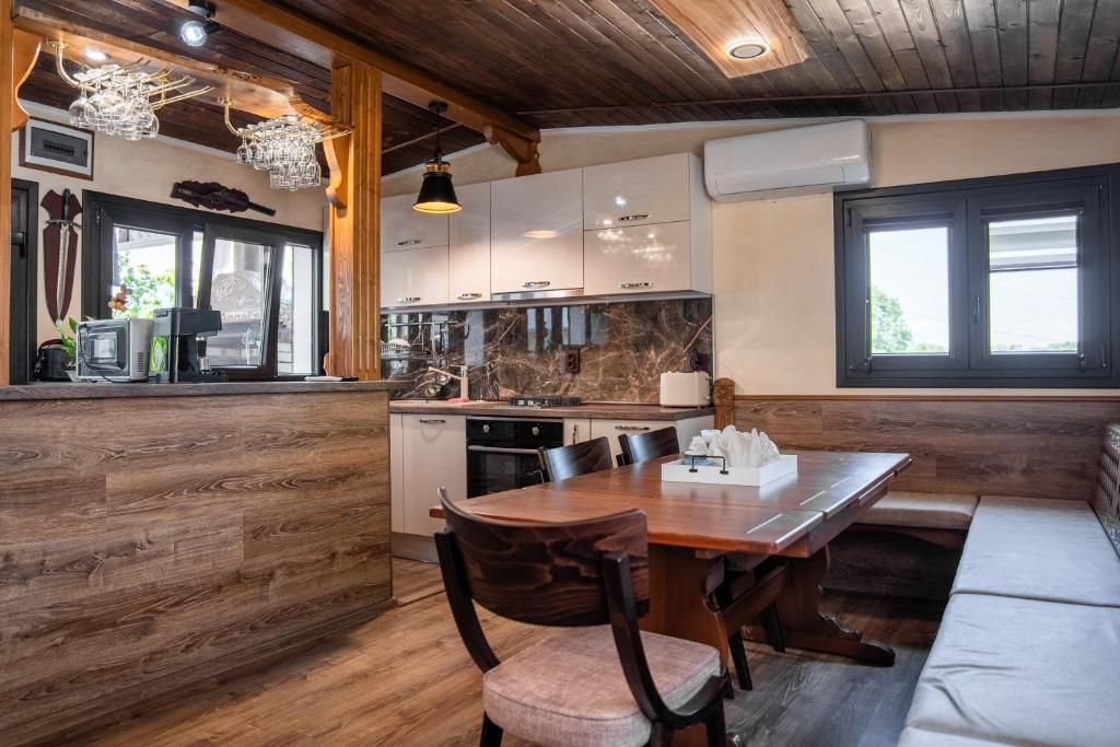 Основната къща е на два етажа: на първия етаж има една спалня + разтегателен диван, както и трапезария с кухненско помещение и баня с тоалетна.