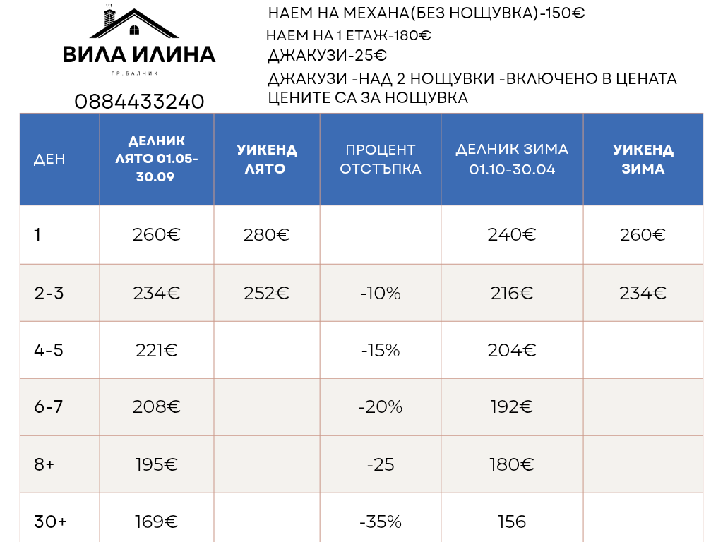 Джакузи: 25 € - Над 2 нощувки е включено в цената.