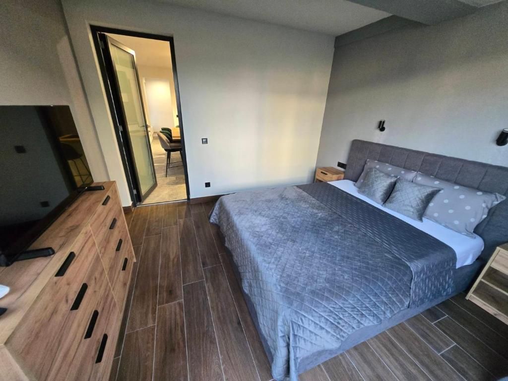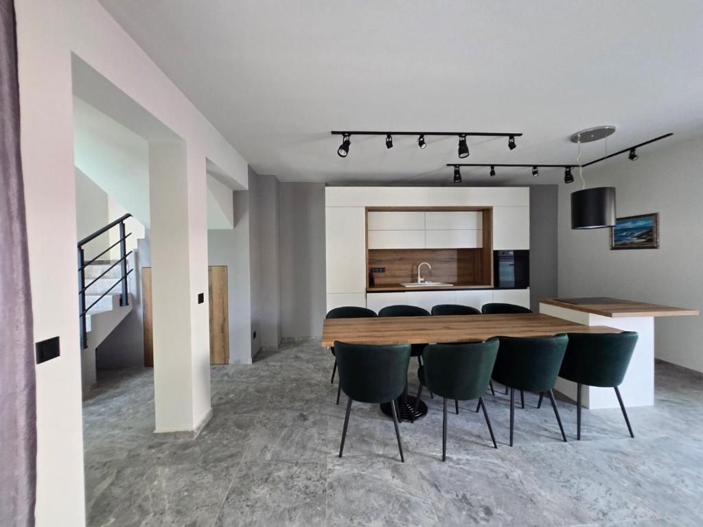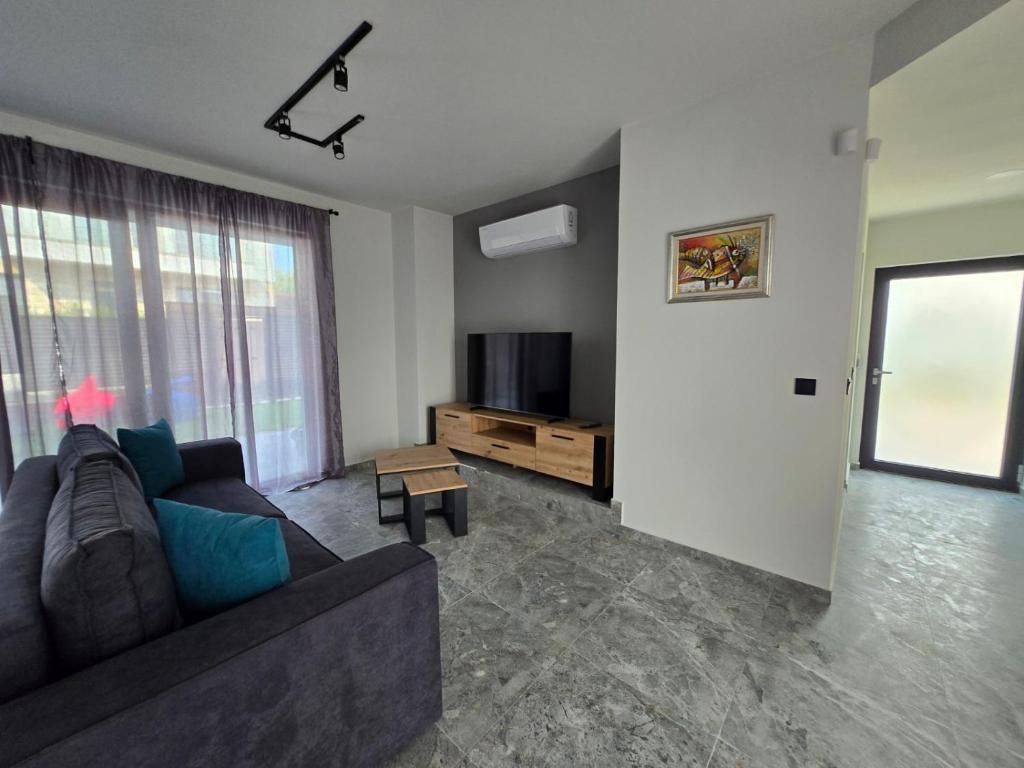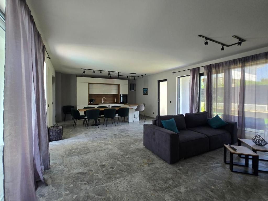 Всекидневната е с 55-инчов телевизор, разтегателен диван (140х200 см), трапезна маса, преминаваща във бар, модерна, напълно оборудвана кухня с индукционен котлон, фурна, съдомиялна и перална машина, кафемашина Неспресо с капсули, ел. кана за гореща вода, тостер и всичко необходимо за вашата незабравима почивка.