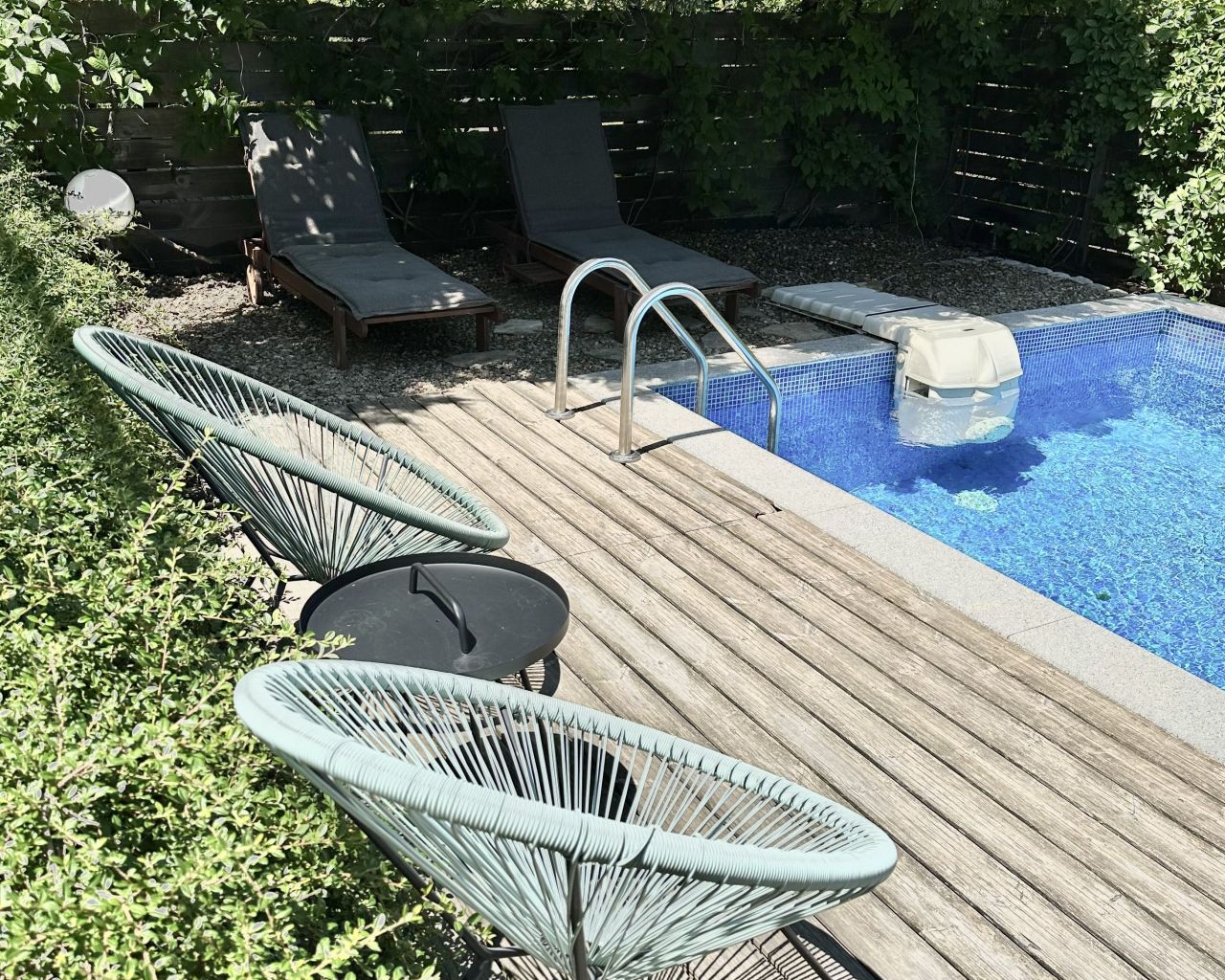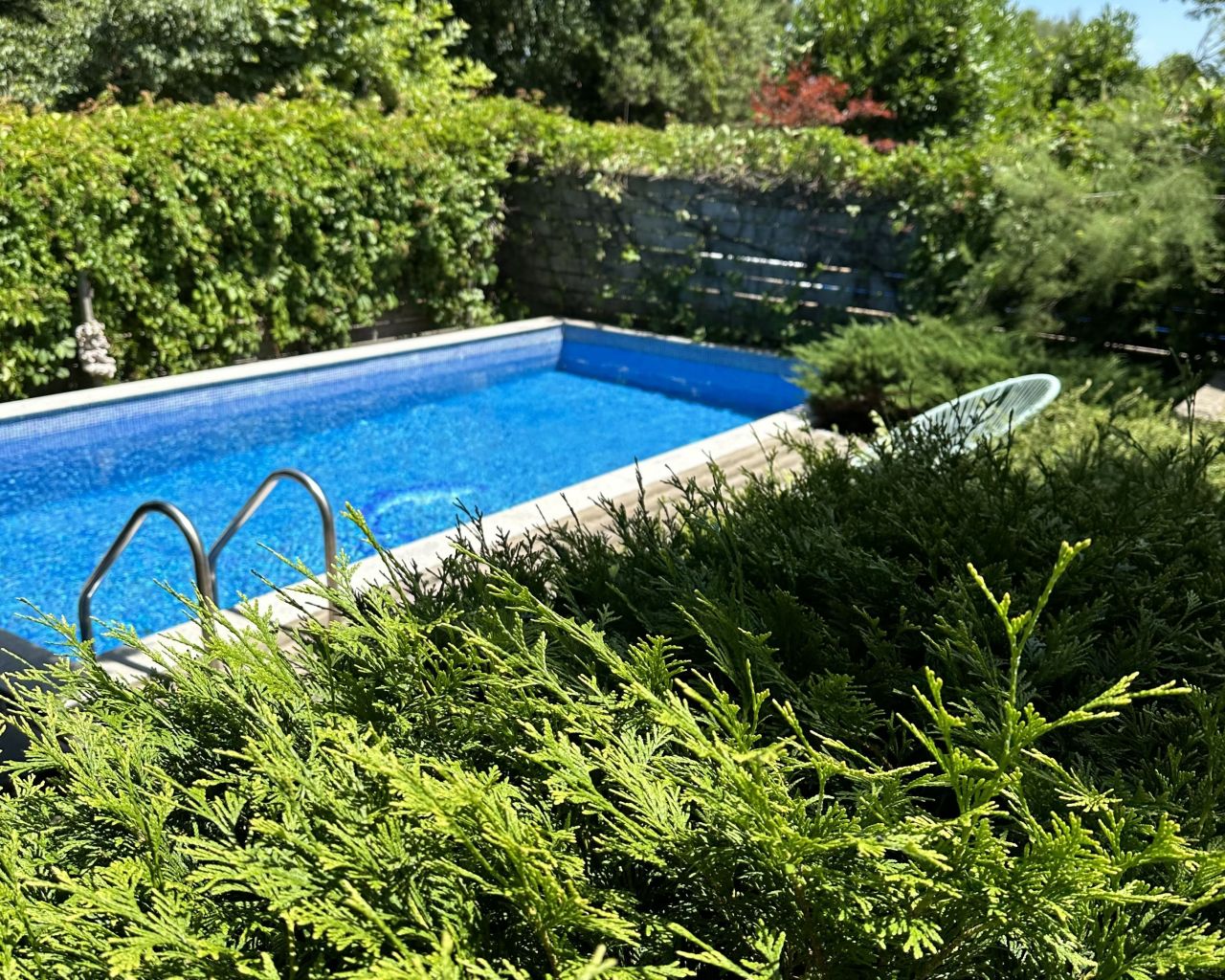 В двора на вилата има басейн. На първия етаж се намират всекидневна с напълно обoрудвана кухня, маса за хранене за 8 човека и кът с мека мебел, разтегателен диван за 2-ма, перално помещение, баня и тоалетна.