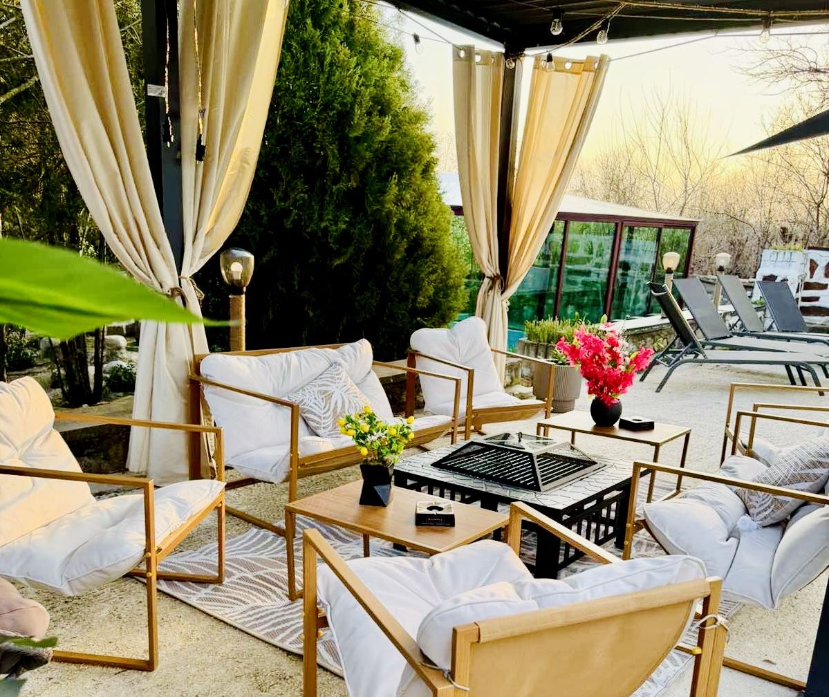 Къщата предлага и вътрешна тераса с капацитет до 12 души - уютна и покрита, както и външна веранда със същия капацитет, където можете да се насладите на чистия въздух и красивата гледка.